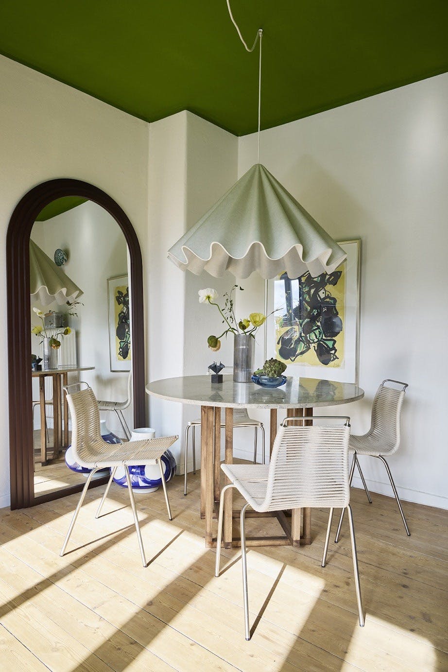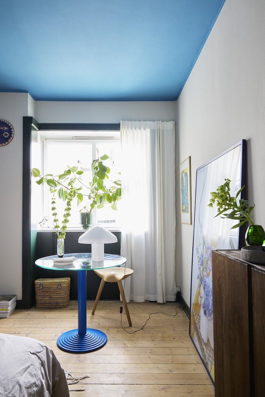 – Fargede himlinger er noe jeg har jobbet mye med de siste årene. De gir rommet farge på en rolig og balansert måte. Akkurat nå leker jeg med kontrasten mellom myke, dempede nyanser på veggene og mer mettede farger i himlingen. Det gir dybde og et yngre uttrykk.