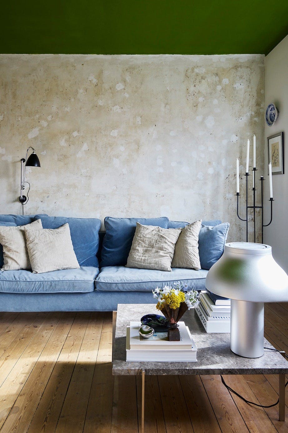 Den rå murveggen gjemte seg bak glassfiberstrien da Mads overtok leiligheten. Han syntes det var en morsom og annerledes løsning, men nå vil han finne på noe nytt, sier han. Vegglampen er fra Gubi, pynteputene kommer fra Ib Laursen, mens gulvlysestaken er et vintagefunn.