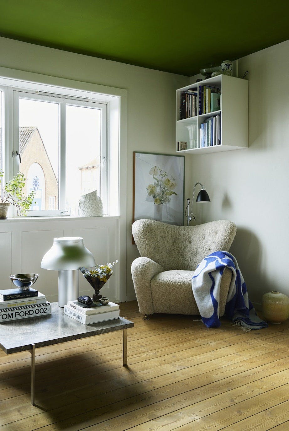 Flemming Lassens lenestol The Tired Man har hedersplassen i kosekroken. Mads har selv lagd bildet på veggen, mens gulvlampen er fra Gubi og pleddet fra Arket.