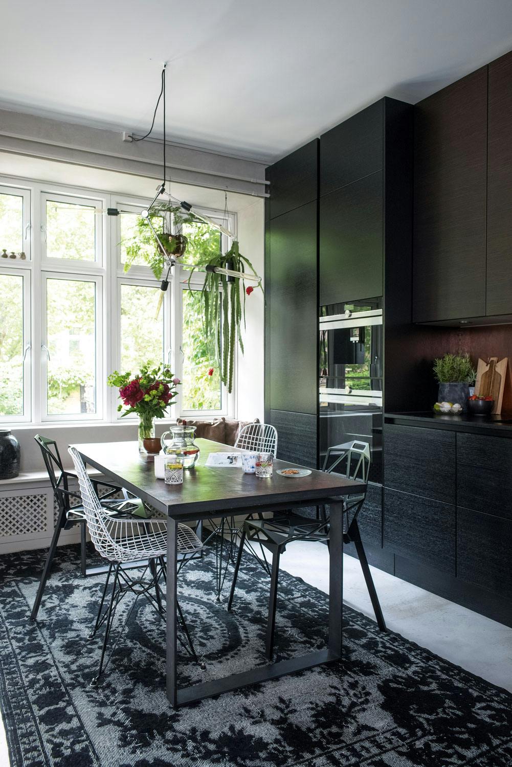 Det store, mønstrete gulvteppe fra Fjord Interior skaper en dramatisk effekt i spisestuen sammen med svarte stoler fra Magis og et mørkt spisebord fra kunstnerverkstedet Kvindesmedjen. Det mørke uttrykket brytes av to hvite Eames-stoler.