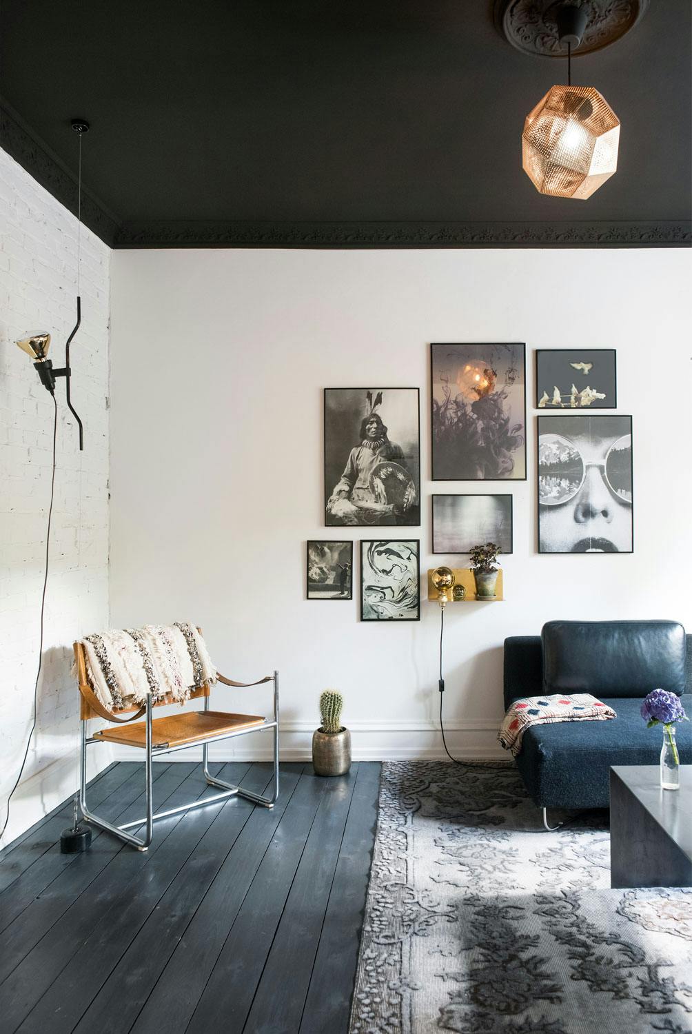 Paret har innredet leiligheten sin med en god porsjon mot, noe som merkes så fort man kommer inn: Den lille gangen har fått et røft betonggulv mot de svarte veggene, og kun noen grønne planter og en lampe lyser opp. De mørke fargene går igjen i hele hjemmet. Både i stuen og på soverommet har takene fått en omgang med svart maling, mens tregulvene er behandlet med en antrasittgrå olje.
