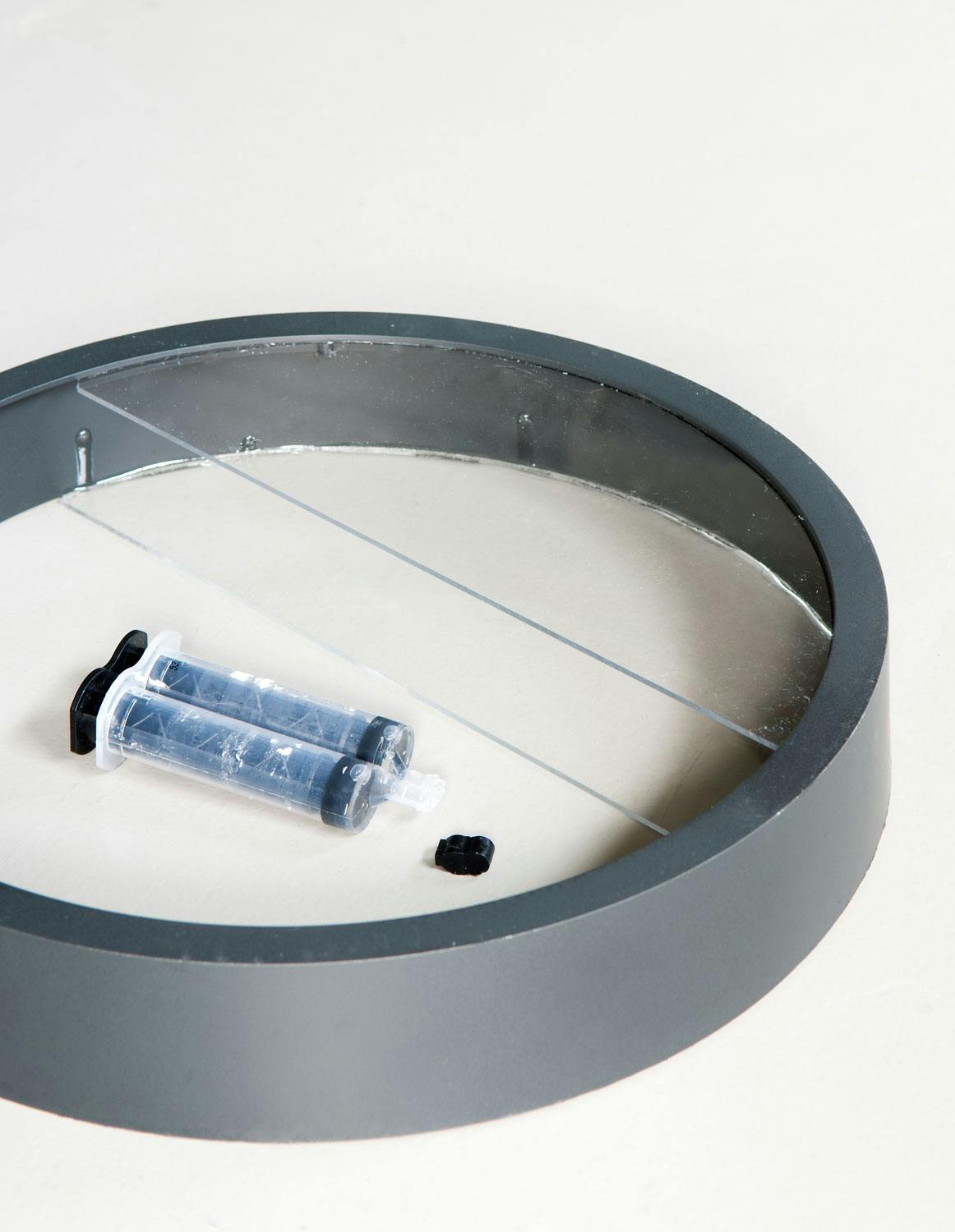 4. Lim de to akrylformene fast i klokkerammen – den lille (halvsirkelen) mot innsiden av fronten på rammen og den store mot baksiden av rammen.