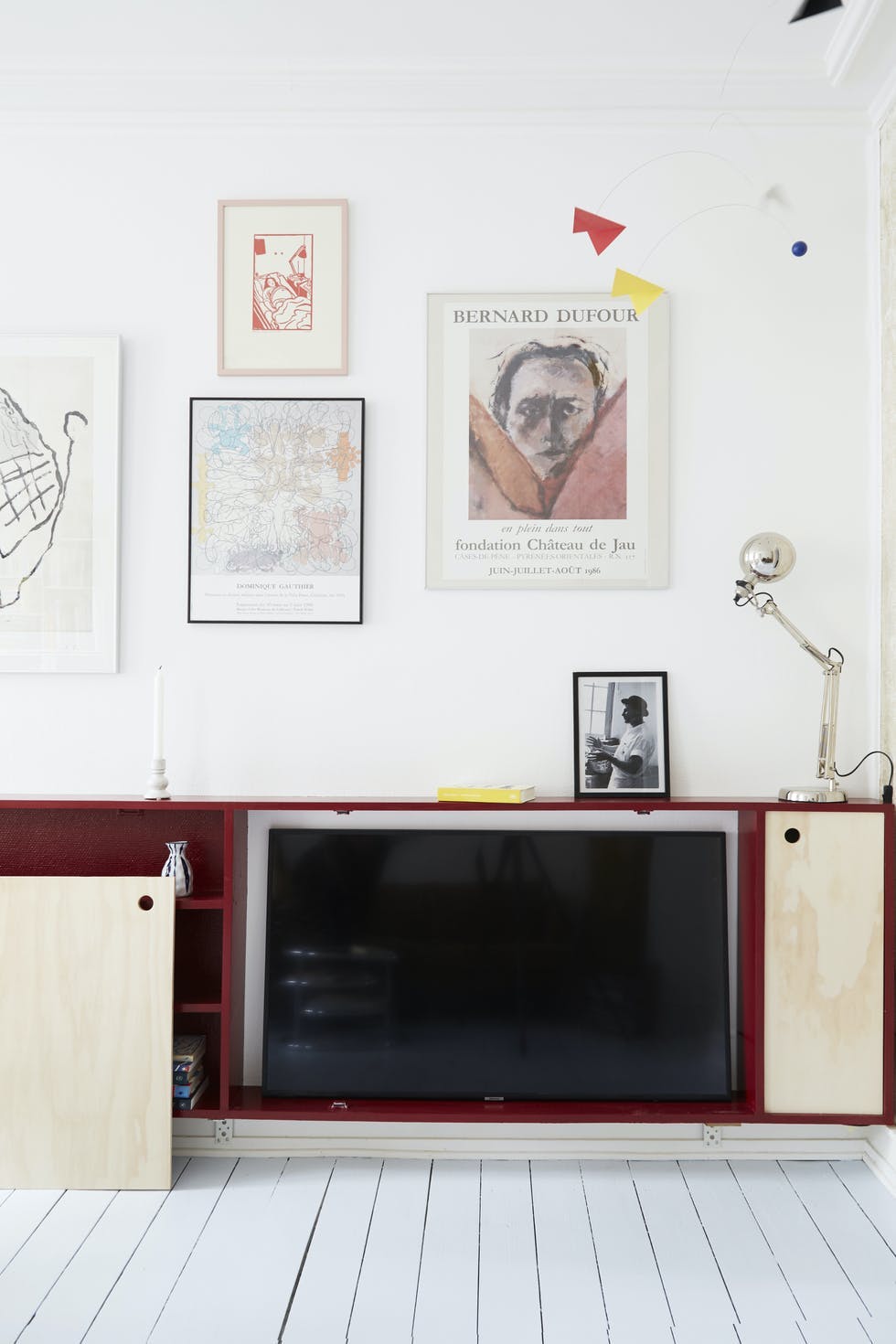 Gjør som Freja og Magnus og bygg din egen skjenk som TV-en får plass inni. Bak dørene skjules TV-en når den ikke er i bruk, og fargen er en fin kontrast til alle de lyse tonene i stuen. Skapdøren er festet med magneter og kan tas helt av når de vil se TV.