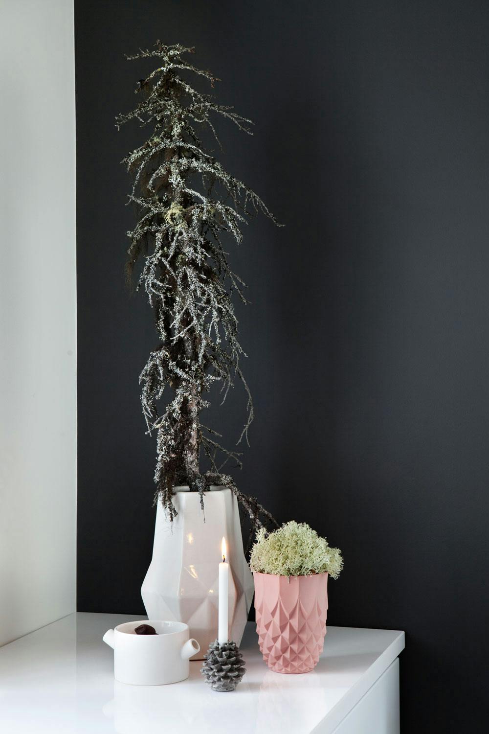 Et lite tre som hun har hentet inn fra tregrensa i fjellet, står hvitt og grått som det er i en vinballong på kjøkkenet. Bare greiner omfavnet av mose er små kunstverk i enkle vaser. På toppen av en rosa designervase hviler en lysegrønn bunt med lav. Men før den kom dit, lå den på vaskerommet og tørket.