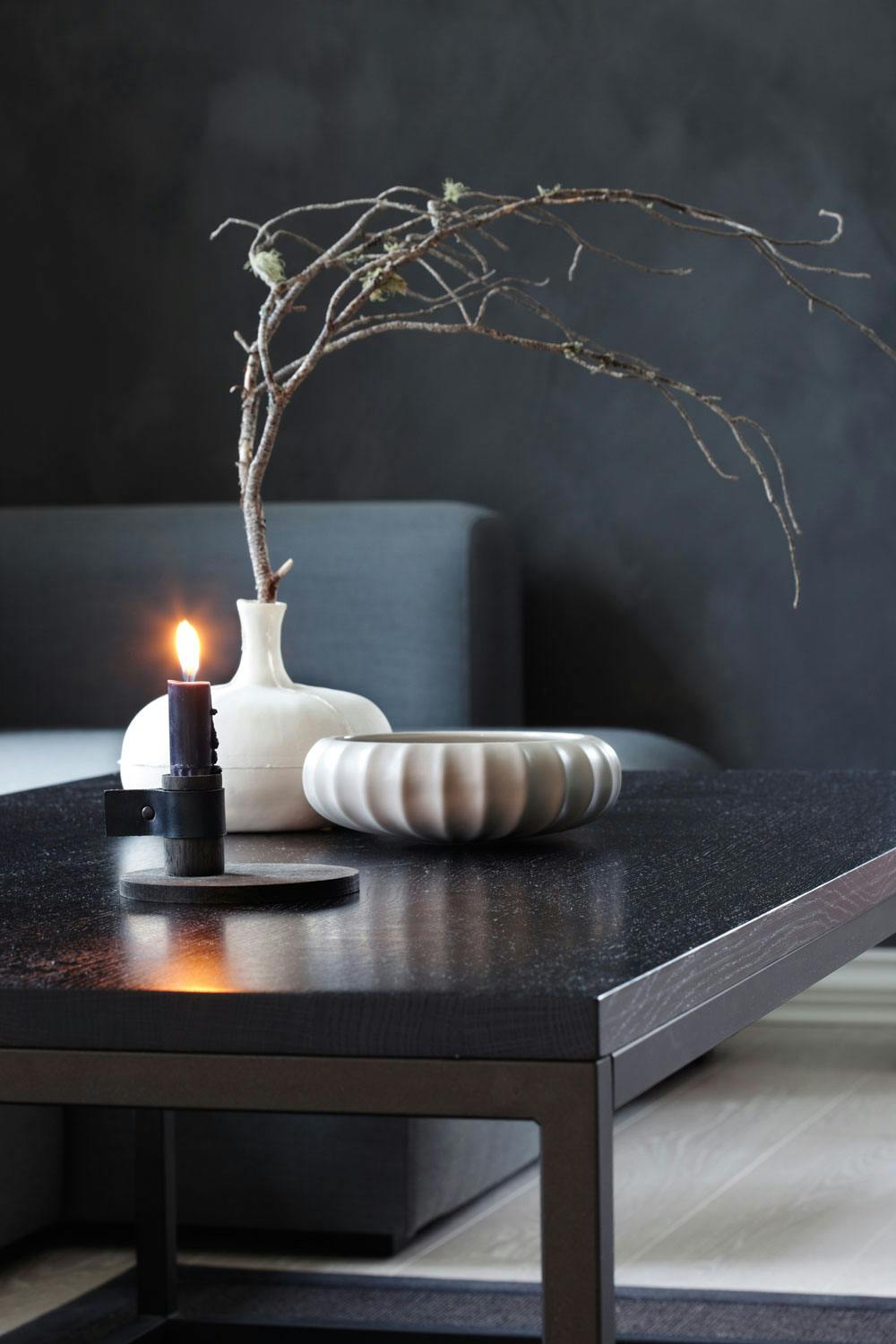 Når elementene har fått en plass i hjemmet hennes, tilfører de myke nyanser av grått og brunt til den kontrastfylte fargeskalaen i svart og hvitt. For basen i Hana og Håvards hjem er enkel med mørke vegger som er fargelagt med kalkmaling og binder de store lyse rommene sammen.