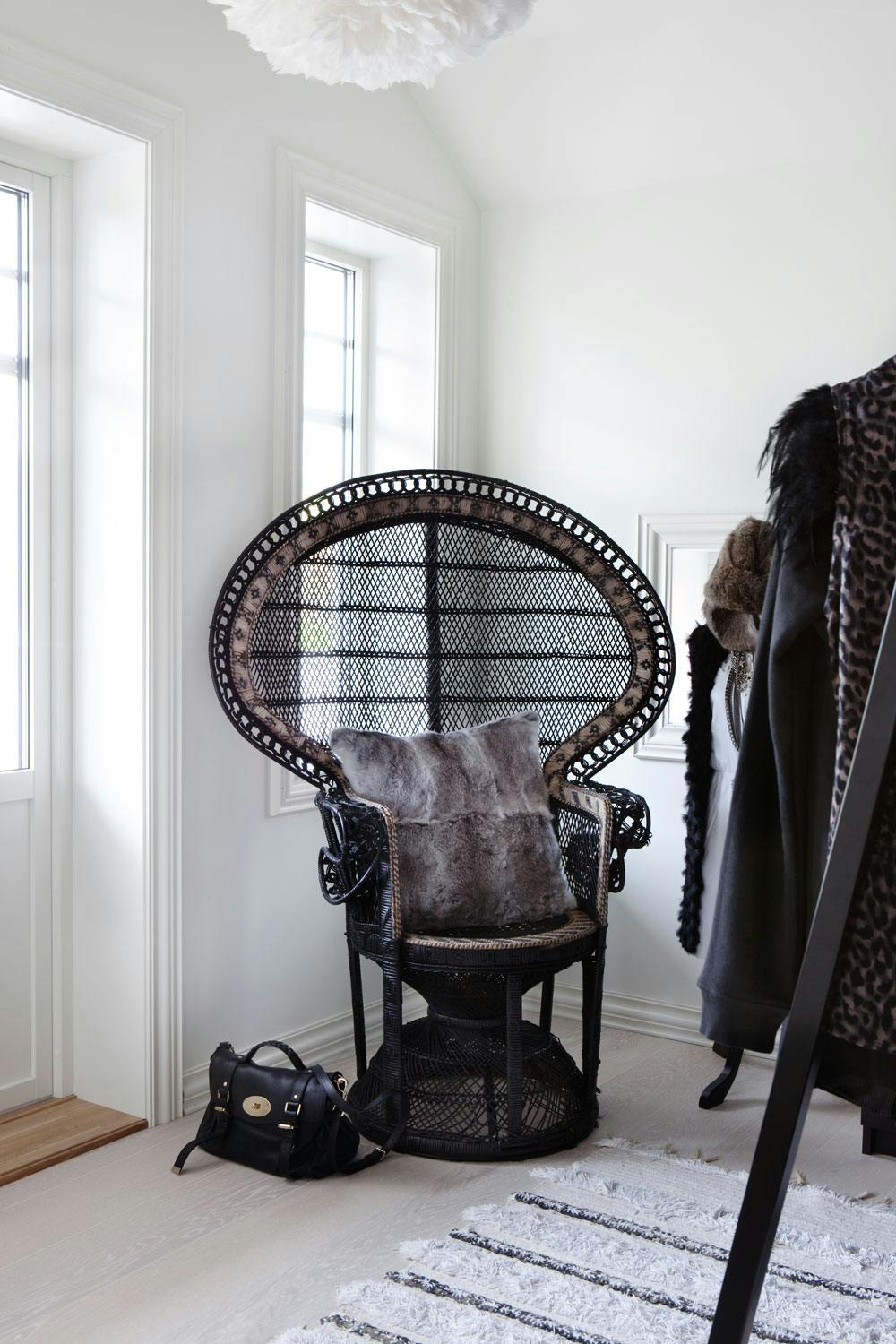 Stuen er hakket strammere i stilen enn i peisestuen som ligger vegg i vegg. Der har Hana innredet med bohemske detaljer, et langhåret marokkanske ullteppe og en stor luftig lampe designet av Mark Eden Schooley.