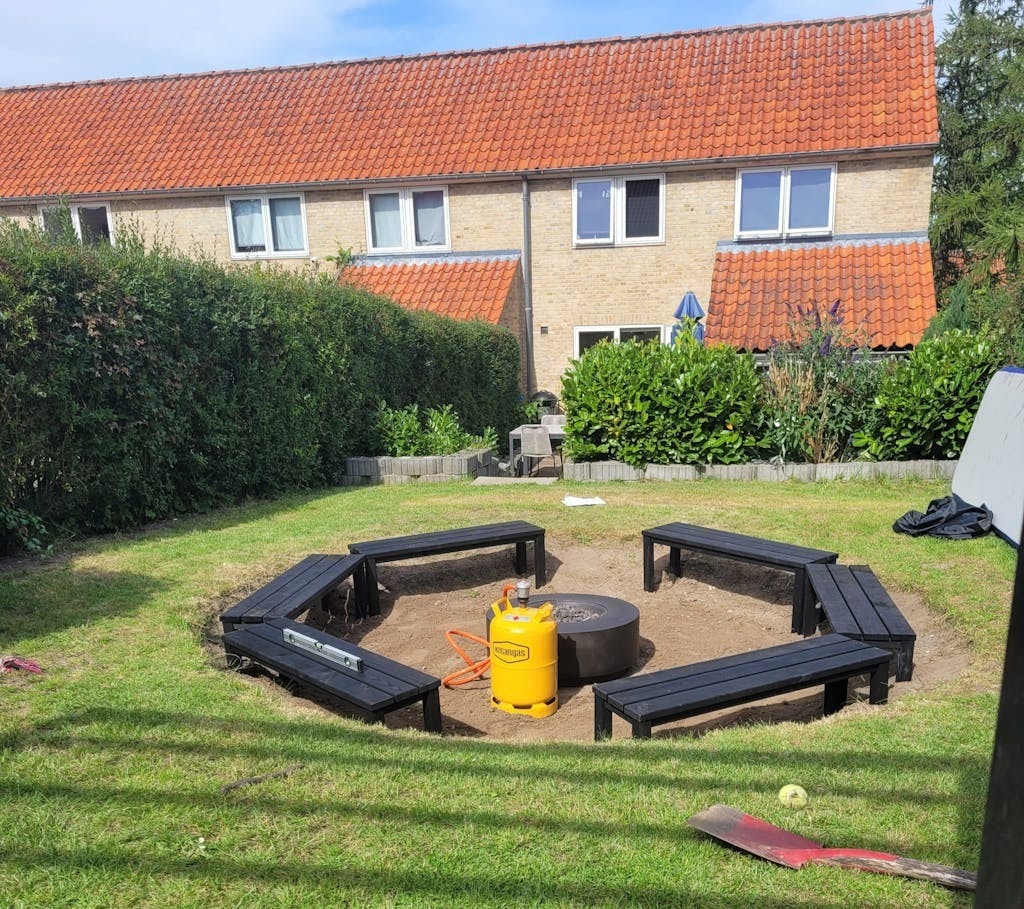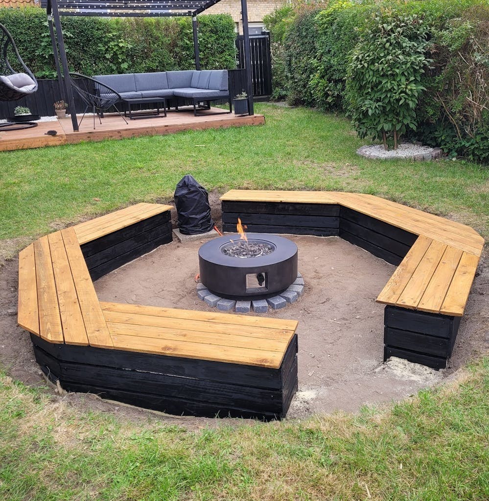 Deretter bygde hun benken rundt kanten. Her har hun tatt utgangspunkt i seks benker fra Harald Nyborg (dansk byggemarked).
