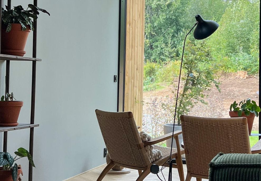 I det fantastiske bygget smelter naturen og huset nærmest sammen, da det er høyt under taket og store vinduer fra tak til gulv på selve fasaden.