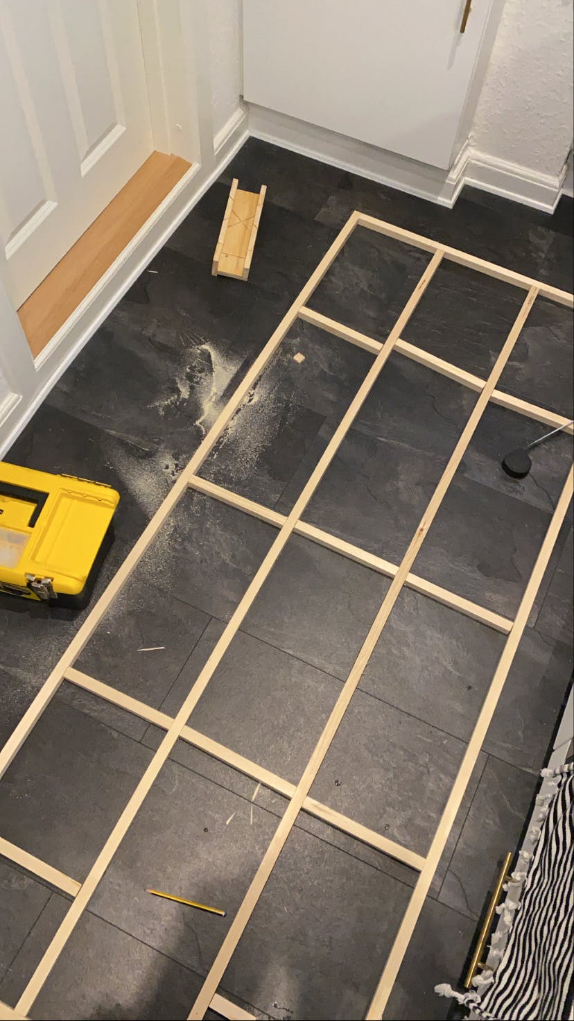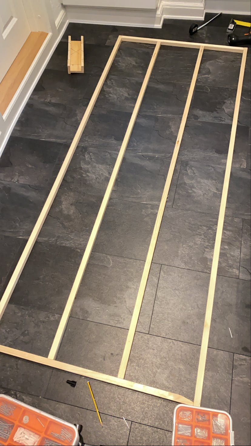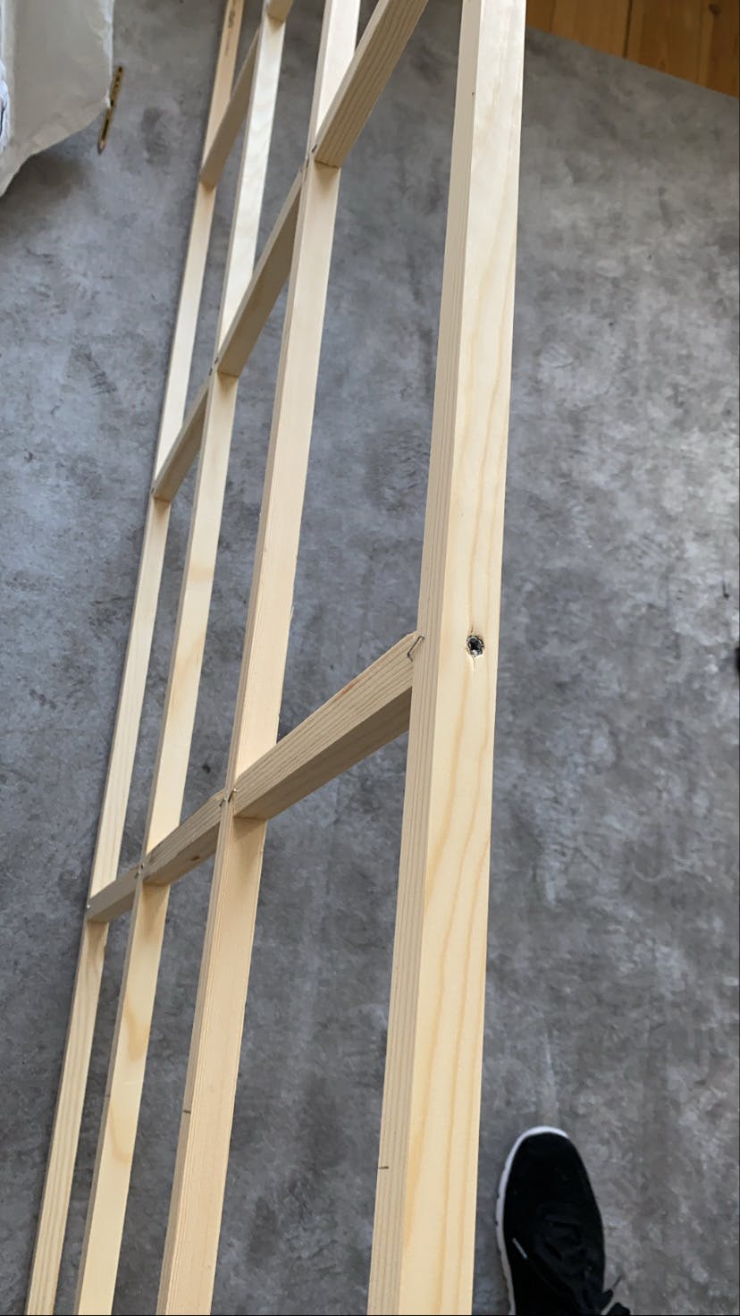 TRINN 2 Nå skal du montere rammen. Lag først det ytterste rektangelet og fest deretter de to lange loddrette listene inni rammen.