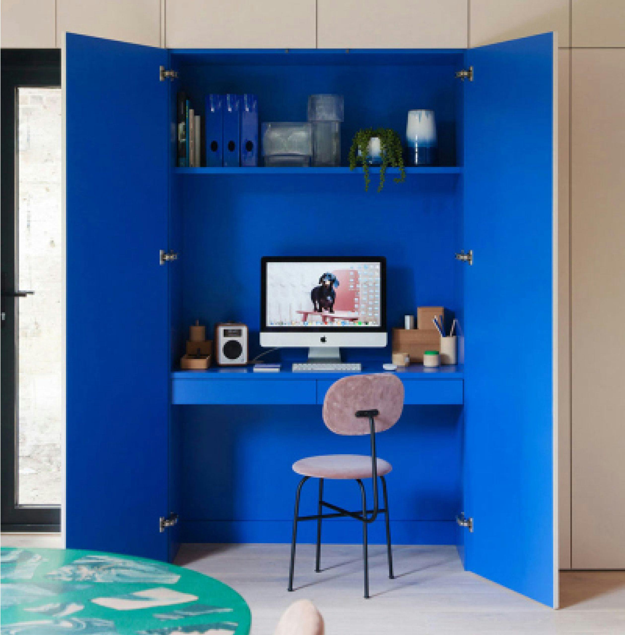 Hvis du har et større skap som du synes tar for mye plass kan du også være så heldig at det kan lages om til en skrivebordsplass som på bildet nedenfor.