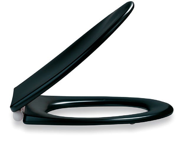 Et kjedelig eller slitent toalett for ny edge med et nyt toalettsete. Sort, blank plast og hvitt porselen går sammen som hånd i hanske.