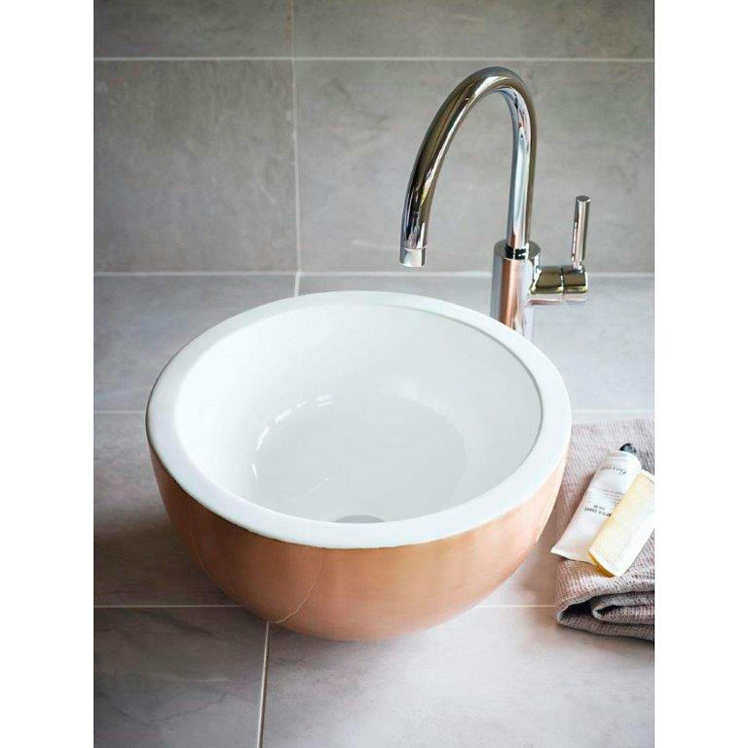 Servant, Ø 36 cm, H 19,5 cm, 17 660 kr, flis, 61 x 30,3 cm, 2588 kr/kvm, og armatur, 13 549 kr, alt fra Fired Earth.