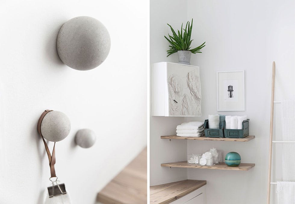 Skapet, furuhyllene og stigen er hjemmelagde. Liten krukke med lokk fra H. Skjalm P. og praktiske akrylbokser fra Nomess. De runde betongknaggene har Mathis støpt.
