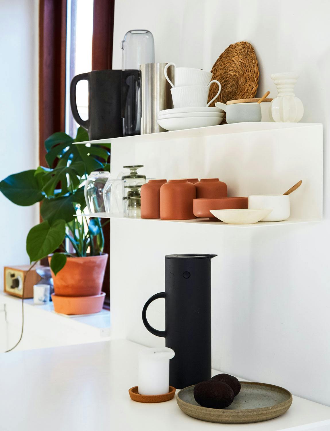Hyllen er fra Ikea, mens porselen og keramikk er fra Ditte Fischer, Søstrene Grene og Royal Copenhagen. Den lille vasen er fra Finnsdottir og glassmuggen fra Muuto, mens termokannen kommer fra Stelton.