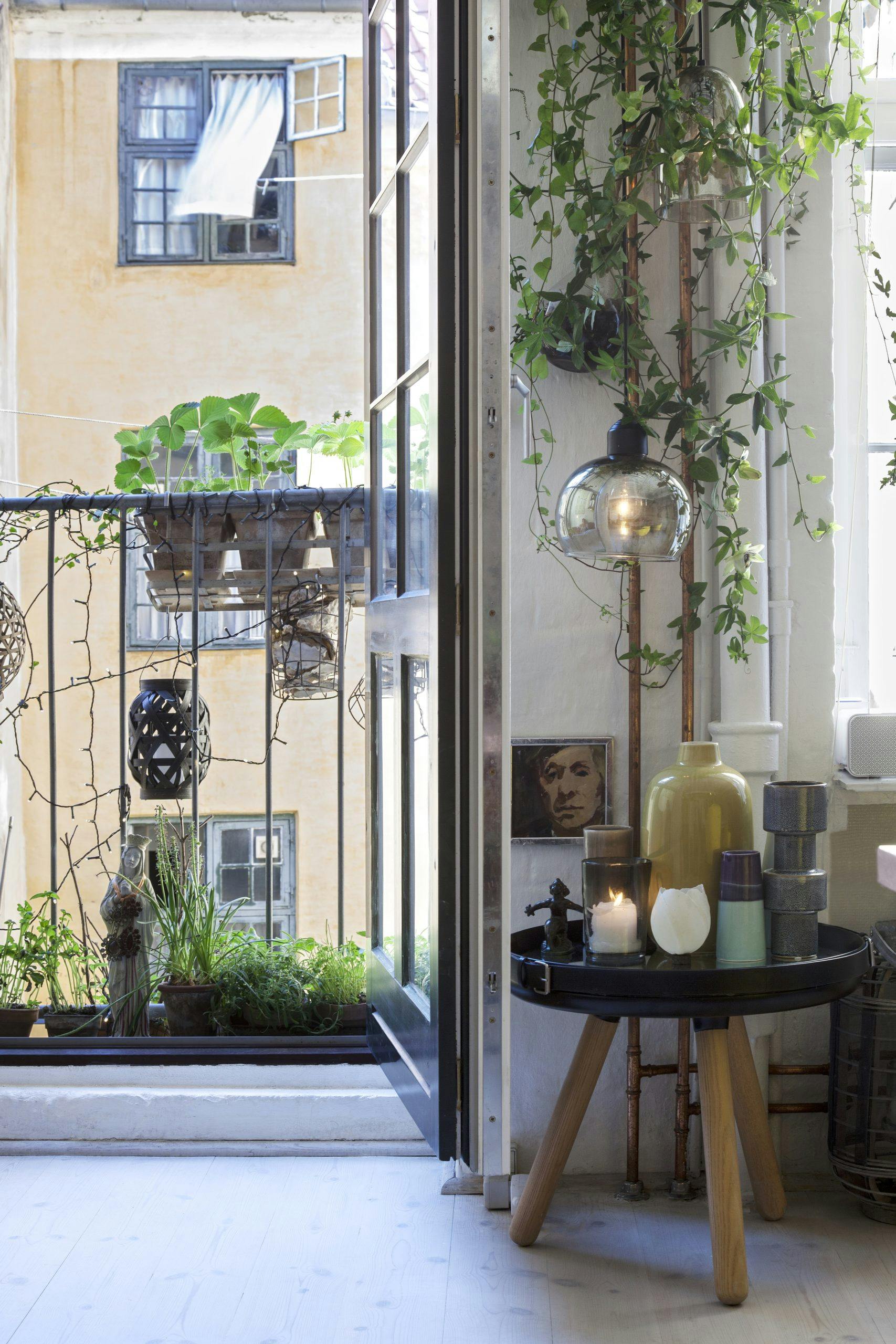 Selv om du bor i en leilighet uten balkong, kan du lage din egen minihage. Her er den franske balkongen utnbyttet til det fulle, men du kan også henge en balkongkasse eller to utenfor vinduene.