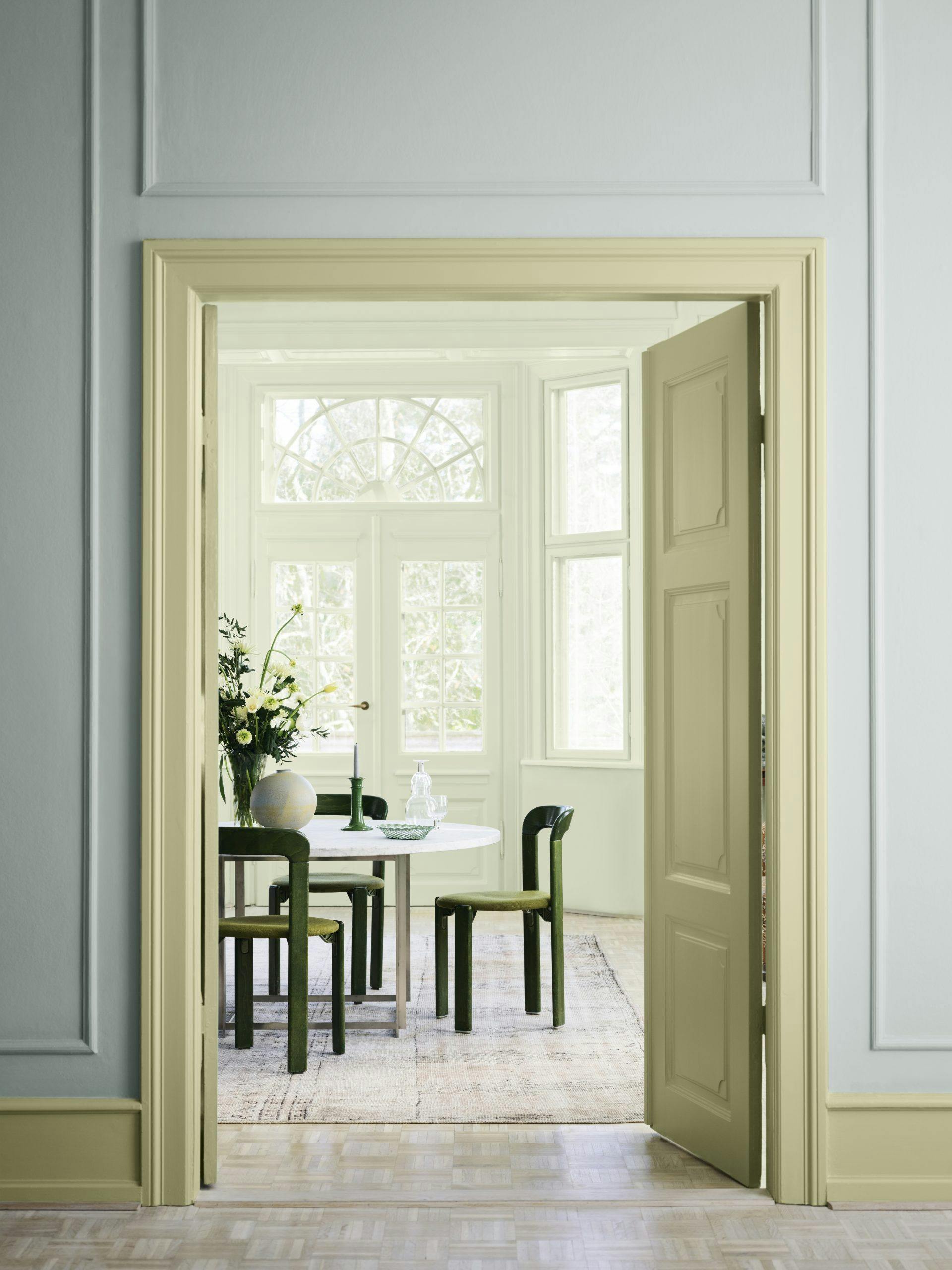 Vi har sett en tendens til at lysegul er brukt mer og mer som veggfarge, men se også hvor fint det er når man bruker en lys, dempet, grønnaktig gultone som denne i taket! Og sammen med den nye lyse grønnaktige blåtonen Spring Breeze gir det et friskt og moderne uttrykk.