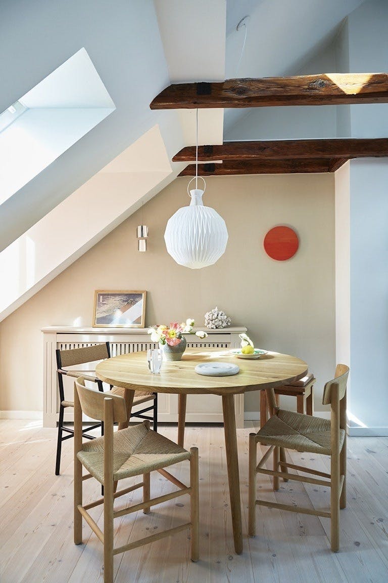 Stemningslys med vegglamper og en pendel over spisebordet bidrar til en hyggelig atmosfære på kjøkkenet. Velg en pære med en fargetemperatur på ca. 2 700 K.