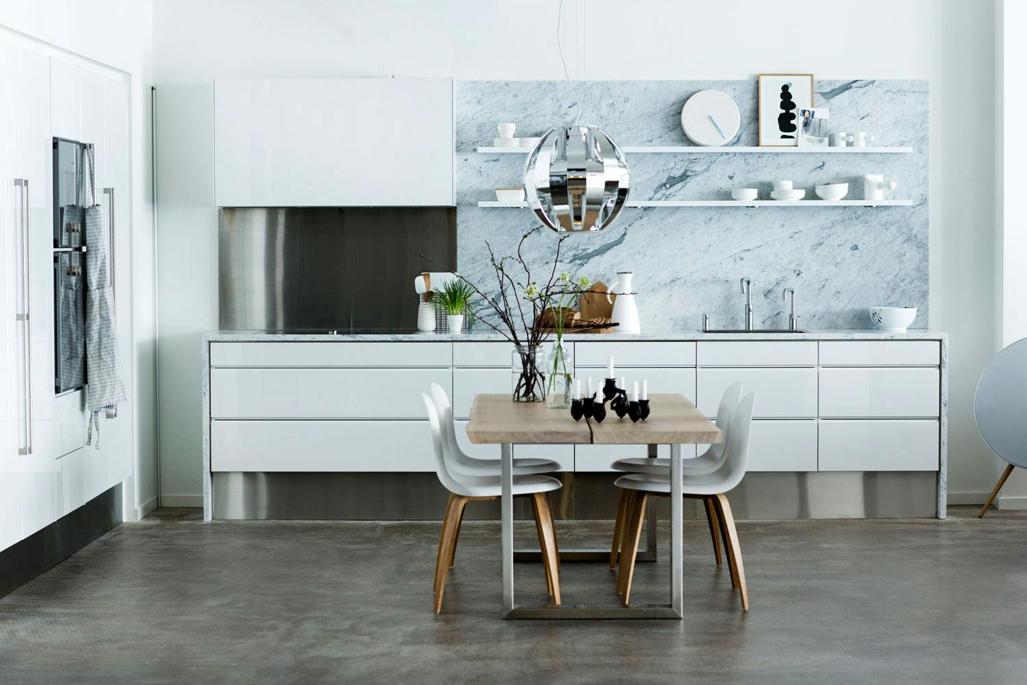 Benkeplaten og veggen i carraramarmor fra Roskilde Stenhuggeri rammer inn kjøkkenet på en vakker måte. Innredningen og hyllene er Form 2 VG i hvit høyglans fra Multiform, mens platen over komfyren er i 20 mm rustfritt stål fra Mølballe.