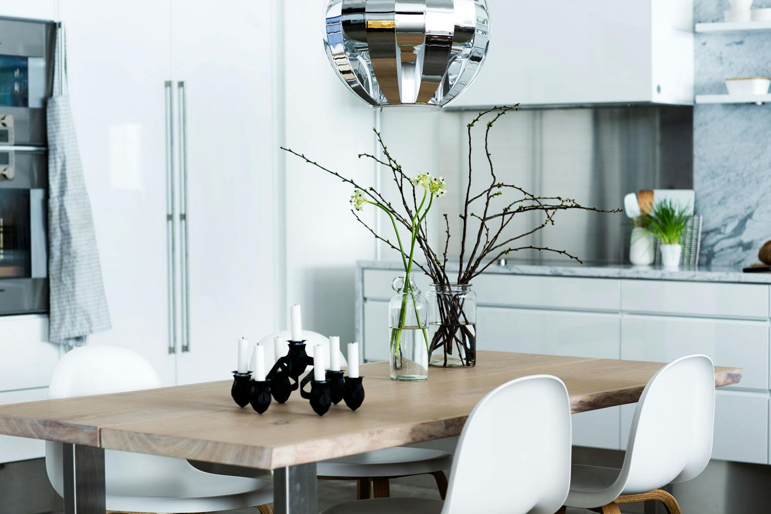 For å gi varme og skape en myk kontrast til de harde materialene som marmor og stål, er det her valgt et hjemmelaget spisebord med eikeplate og stoler med treben. Dette er laget av 40 mm tykke eikeplanker og ben av stål.