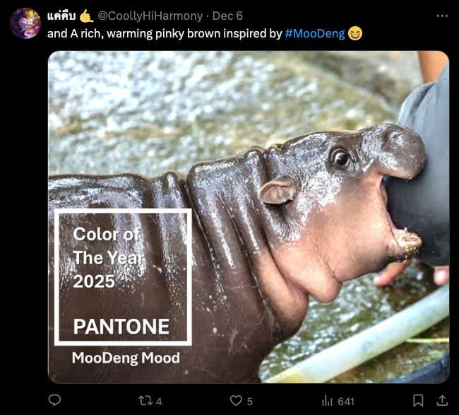 Som en annen bruker påpeker, minner fargen om et av de få lyspunktene i mørket: pygméflodhesten Moo Deng, som gikk viralt i september med en video der hun lykkelig setter sine små tenner i dyrepasseren sin.