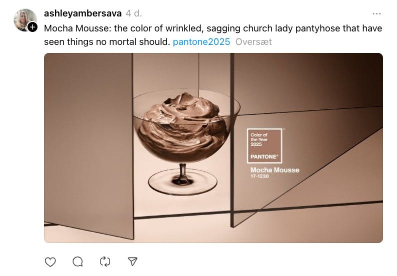 "Har noen hos Pantone sett profilen "" Triste beige klær til triste beige barn "" og syntes den var holdbar og inspirerende?" står det i en profil på Instagrams svar på Twitter og X, Threads.
