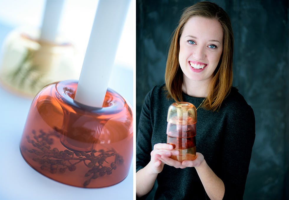 Den unge designeren Thea Jegerud står bak disse enkle og fine lysestakene i transparente farger. Den lekne, men funksjonelle formen gjør at lysene står stødig, og fargene er valgt ut for å passe godt inn i norske hjem.