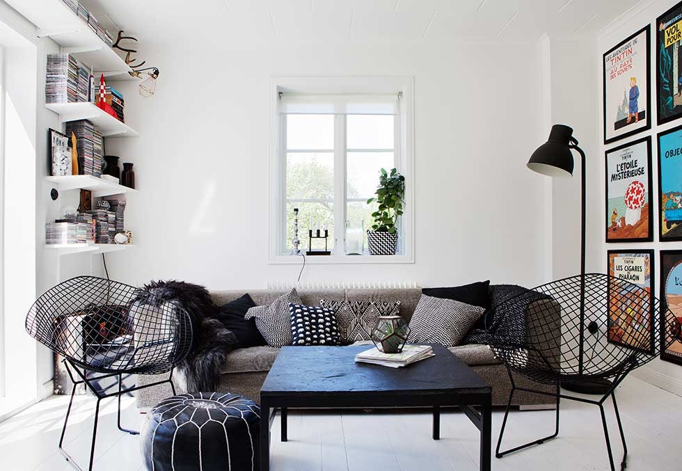 Stuen har fått et grafisk inntrykk med en vegg dekket av favorittplakater i perfekt symmetri - som du ser bedre på bildet over. Fargeinnslag fra bøkene henter igjen dette.