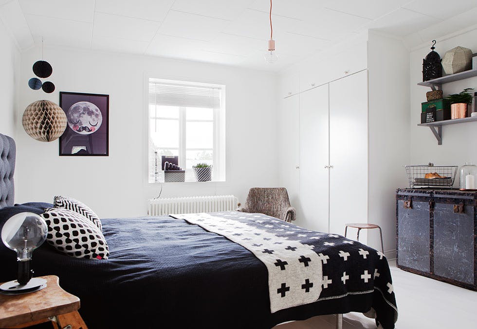 På soverommet til Johanna og Patrick står en gammel kiste som kommer fra havneområdet i Gøteborg. Sengeteppet er fra Pia Wallén.