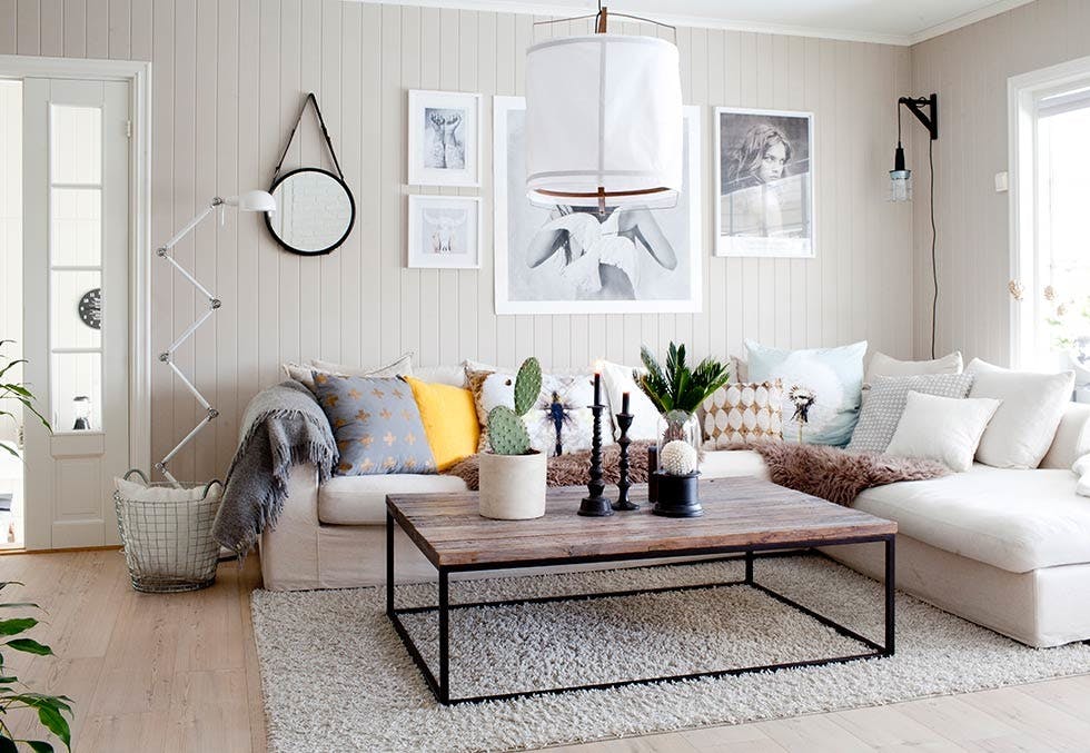 Stuen har lyse farger som base. For å unngå at uttrykket blir monotont har Tonje spritet opp med tekstiler i farger og grønne planter på bordet.