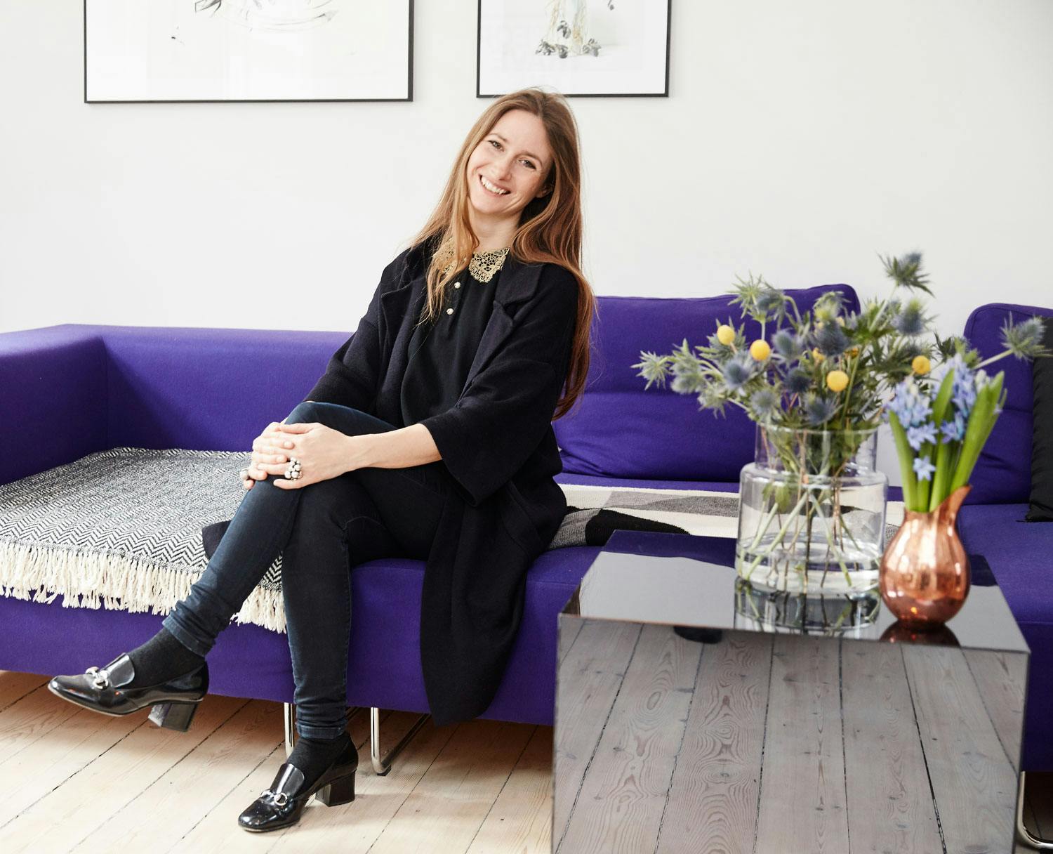 Stuen er fargerik, men samtidig ren og enkel. Den lilla sofaen er et arvestykke, og får dominere rommet sammen med kobberlampen fra Tom Dixon. Det er plass til mange i den store modulsofaen, der de forskjellige delene flyttes rundt etter behov. Pleddet er fra Missoni.