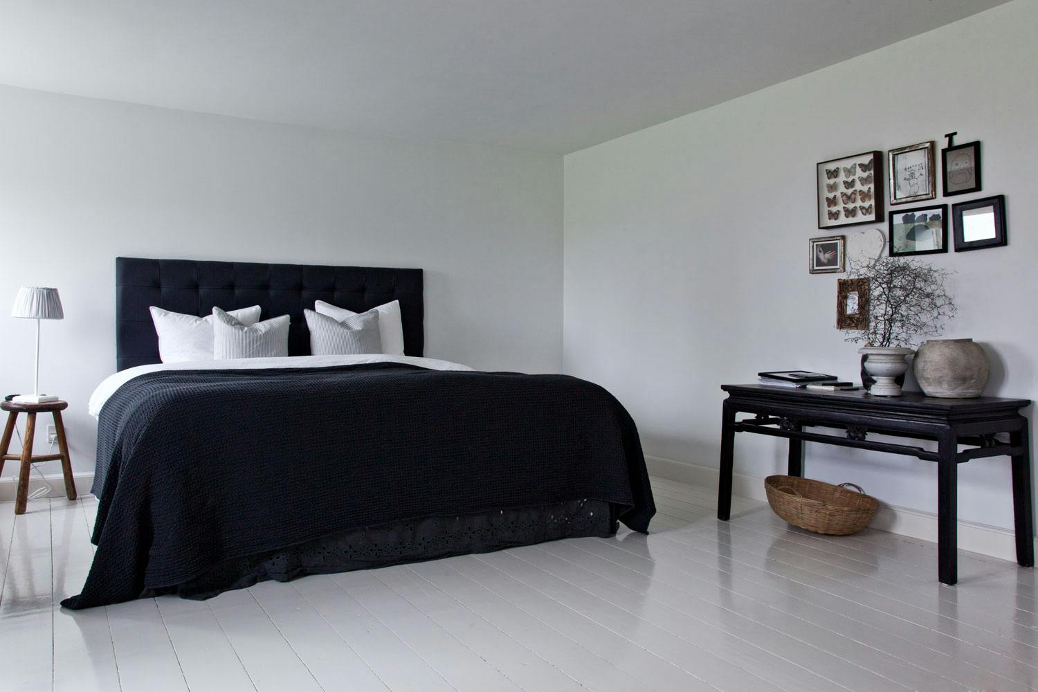 Også soverommet er preget av kontraster i svart og hvitt. Et tradisjonelt vietnamesisk sidebord, som Tine fant på en utenlandsreise, har fått selskap av antikke krukker.