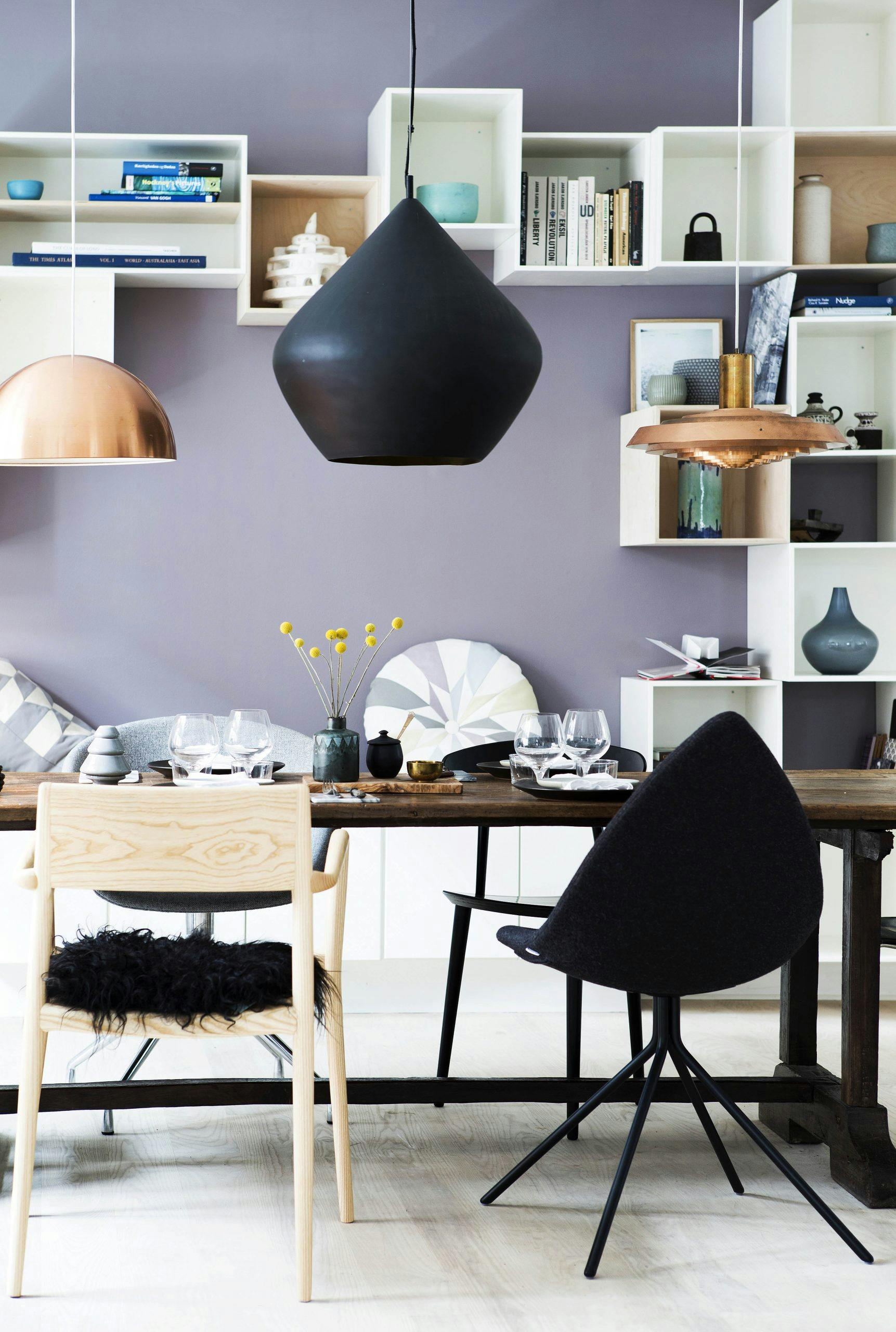 Du kan endre hele rommets karakter med lamper. Våg å velge forskjellige lamper med ulike former over spisebordet. Lampen til venstre er en Louisiana-pendel, den svarte lampen er fra Tom Dixon, og lampen til høyre er Poul Henningsens tallerkenpendel, men du kan sette sammen dine egne favoritter. Velg justerbar belysning, for å ha muligheten til å velge stemningsskapende lys når middagen skal inntas. Spe på med lyspunkter ellers i rommet, og ha rikelig med stearinlys.