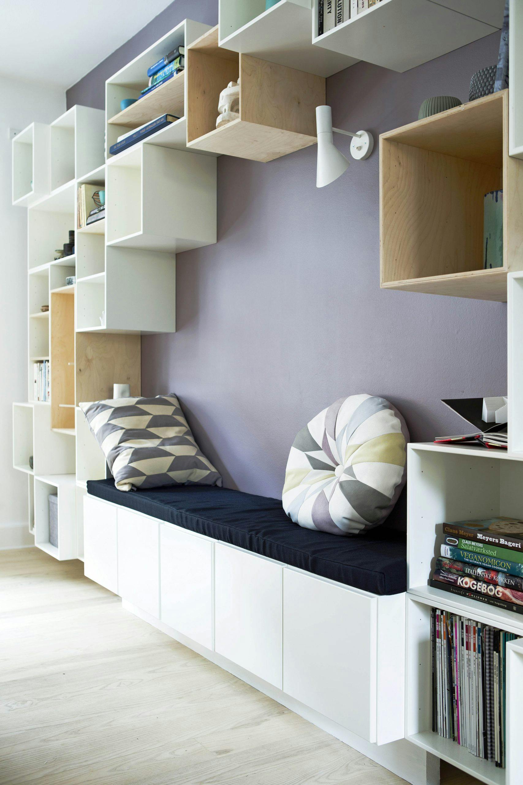 Kombiner hyllevegg og sitteplass. Her er det spesiallaget en benk med skapplass. Hvis du ikke ønsker å snekre den selv, kan du bruke ventilatorskap eller andre modulskap fra for eksempel Ikea til å lage benk av. Da får du oppbevaringsplass på kjøpet. Klipp til en skumgummimadrass og sy på et trekk for å få en behagelig sittepute, som her. Fyll på med pynteputer. Disse er fra Place de Bleu.