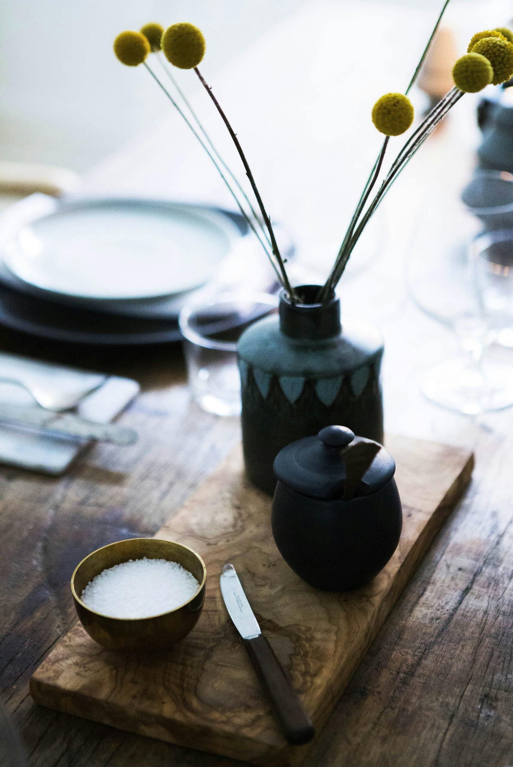 Sett lysestaker, blomster og annen bordpynt på en fin skjærefjøl. Slik kan dekorasjonen enkelt flyttes dersom den står i veien uten at stillebenet ødelegges. Det er kult å mikse loppefunn, arvegods og utvalgte skatter fra reiser eller butikker du elsker.