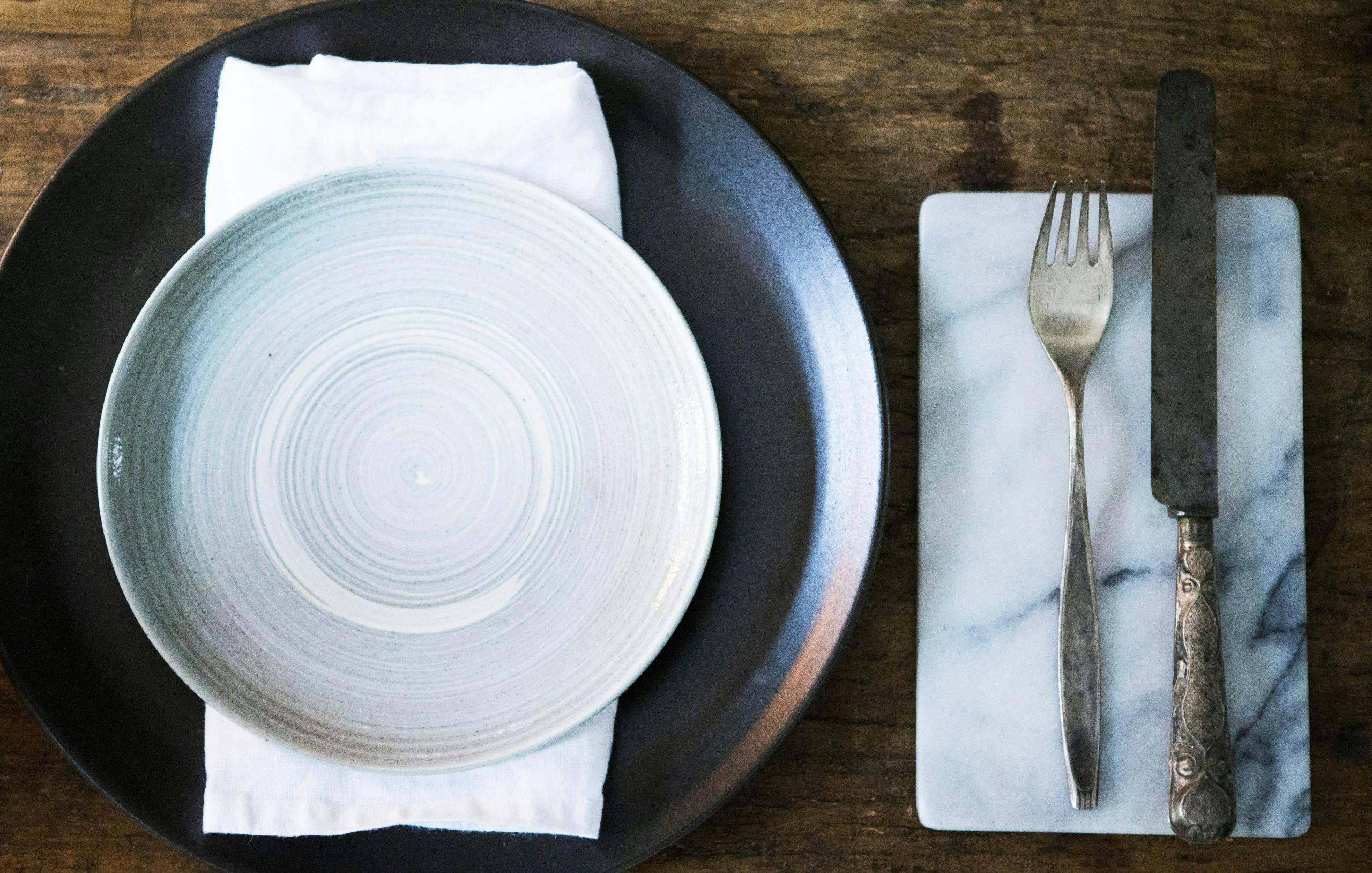 Legg bestikket på små brett ved siden av tallerkenen. Det er en stilig måte å vise frem pent bestikk på, og brettet fungerer utmerket som sidetallerken. Marmor setter en elegant spiss på kuverten, men her kan du også bruke små skjærefjøler i tre eller keramiske fliser om du ønsker. Marmorbrettene og bestikket er funnet på loppemarked.