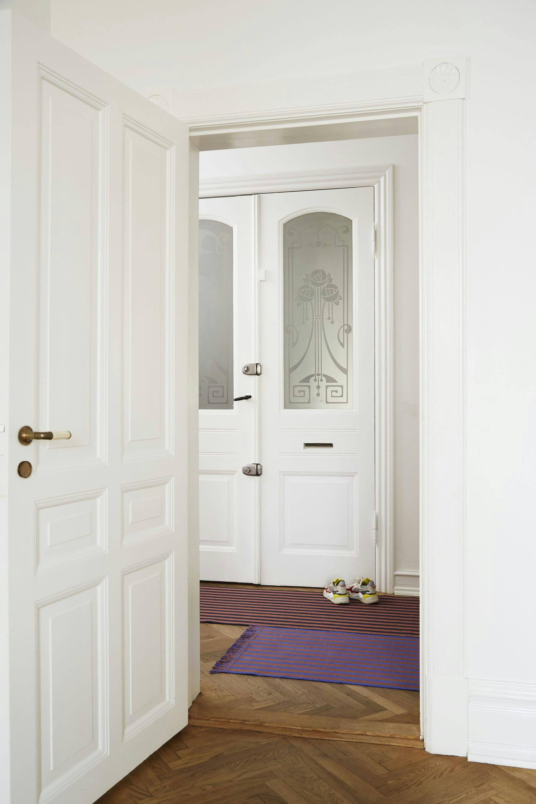 To grafiske løpere som gulv teppe fra Hay gir farge og liv til den hvite gangen.