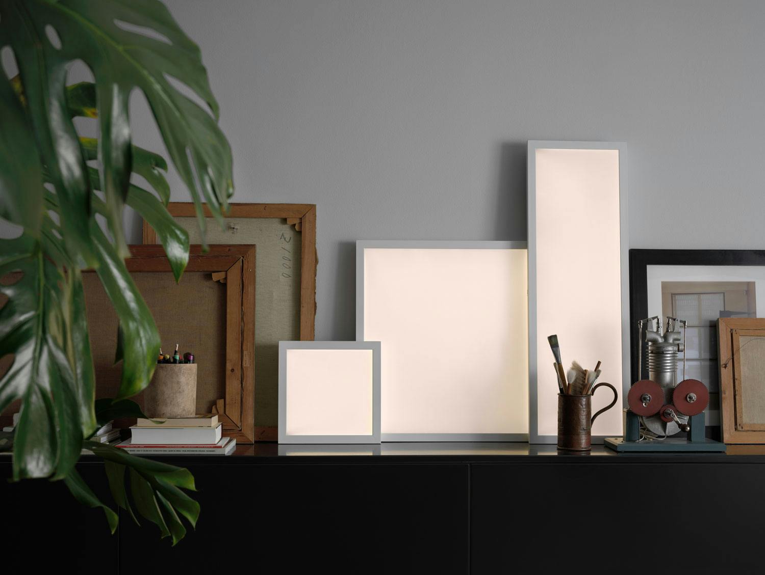 Floalt lyspaneler kommer i tre ulike størrelser og kan monteres på veggen eller i taket. De kan dimmes i tre steg med Trådfri-fjernkontroll eller appen. Lyspanel, 60 x 60 cm, 1295 kr, 30 x 90 cm, 1295 kr og 30 x 30 cm, 799 kr.