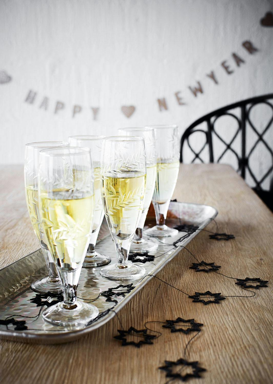 Champagneglass, H 17 x Ø 6 cm, 70 kr, brett, 61 x 18 cm, 299 kr, girlander med stjerner, L 2 m, 70 kr, girlander, Happy New Year, L 1 m, 40 kr, alt fra Madam Stoltz.