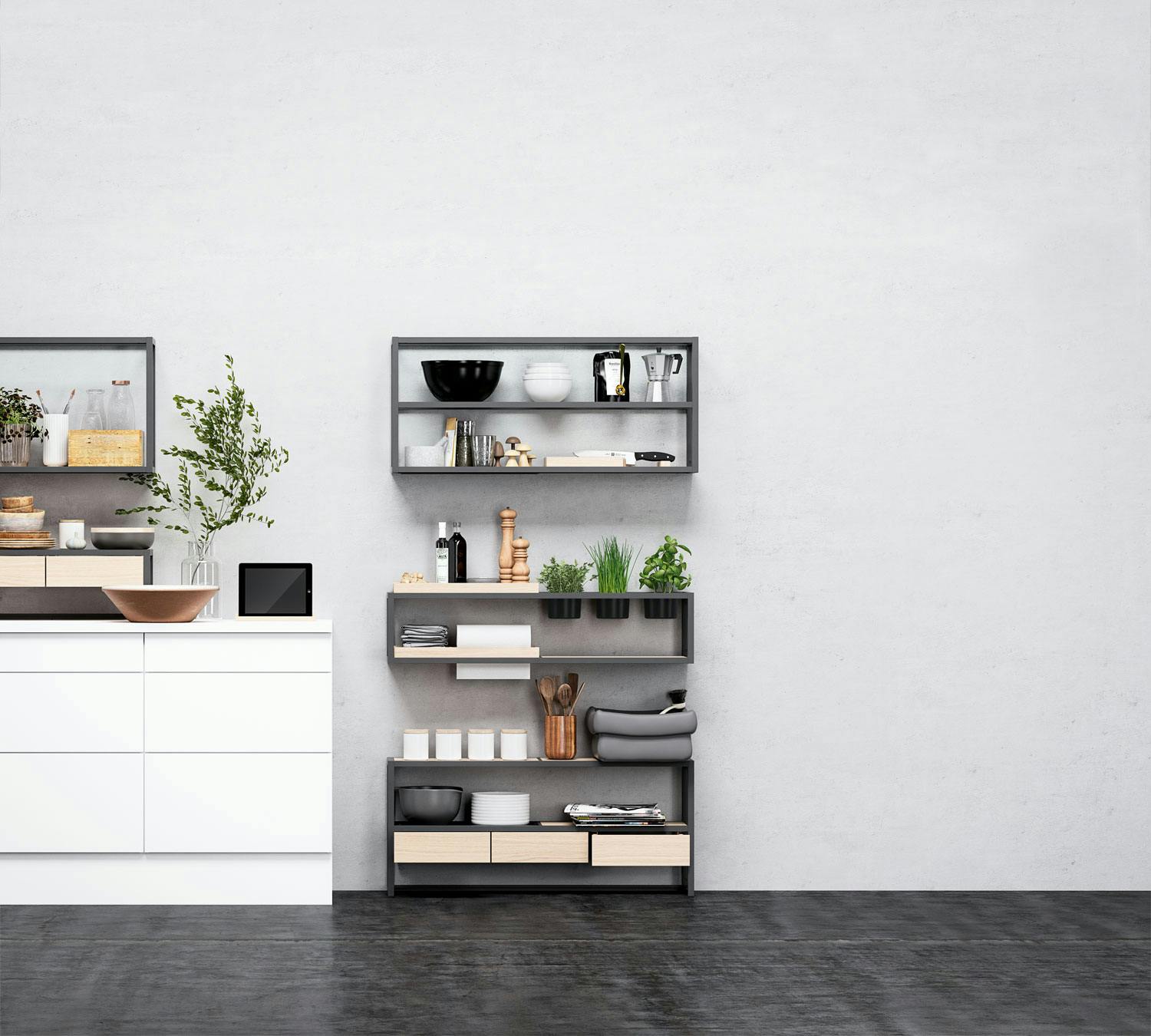 Hyllesystem, Frame FlexID, består av en rekke forskjellige moduler. Rammer av metall for vegg eller gulv. Kombinasjonen av de tre hyllene som vist her, kommer på 6608 kr, HTH.