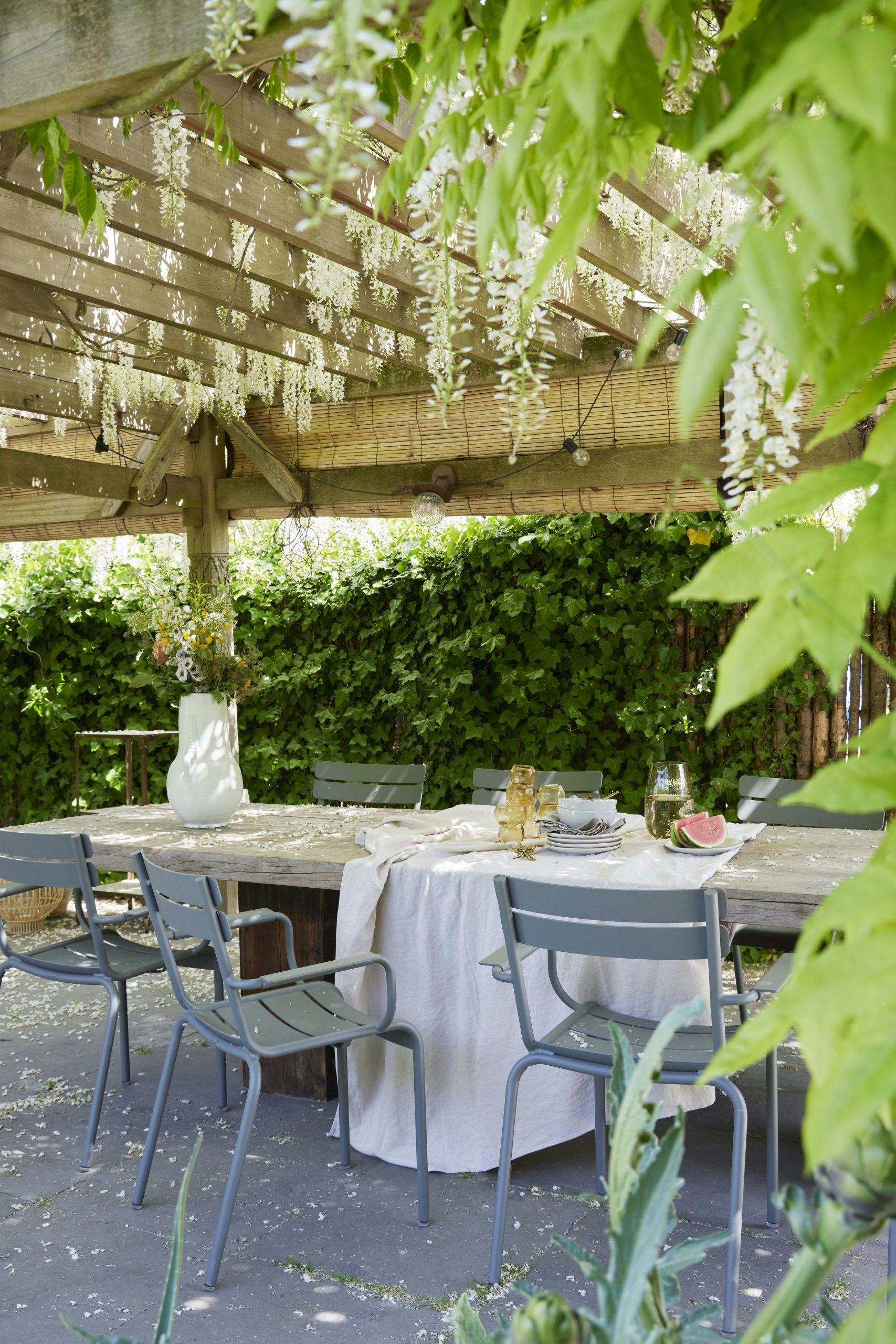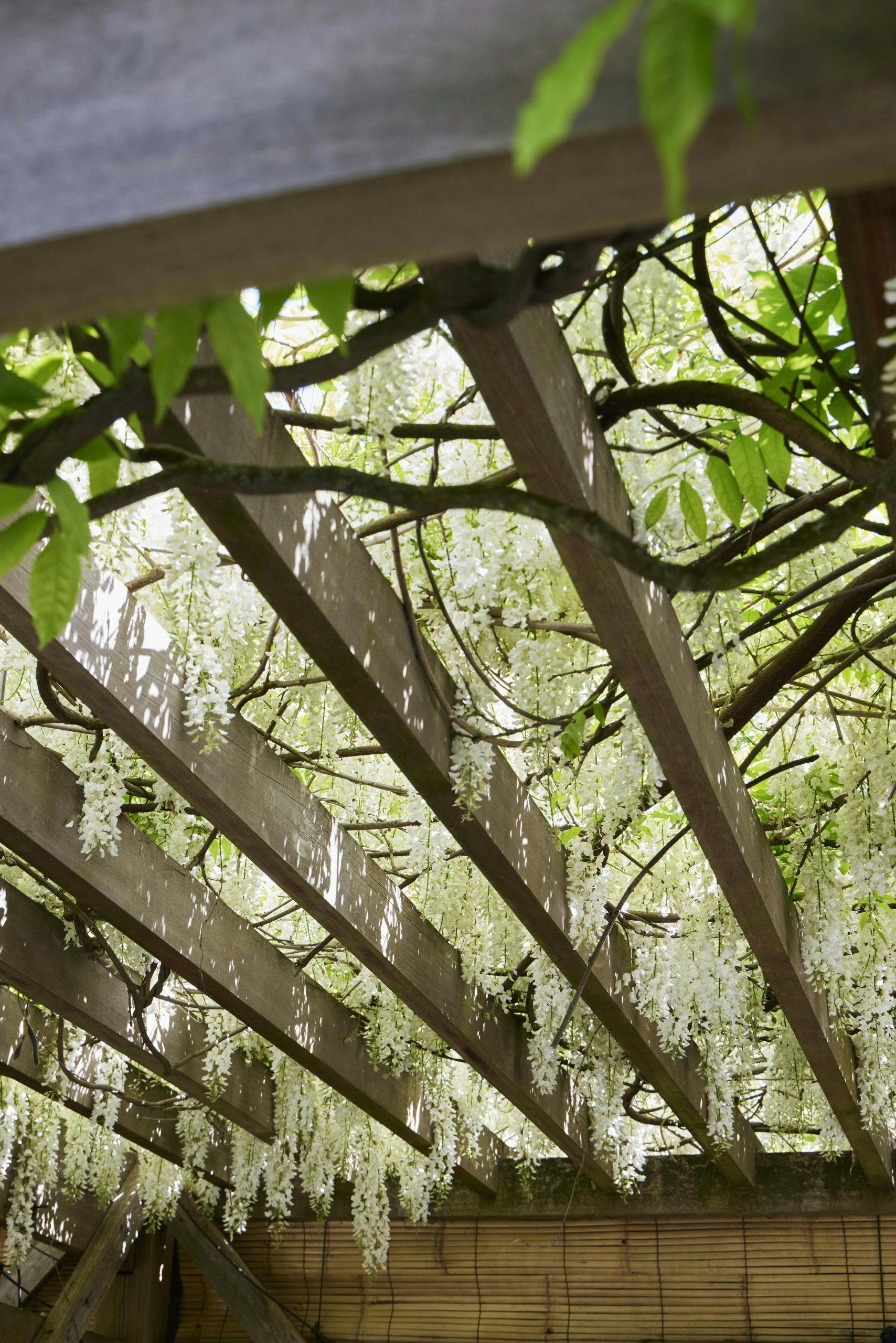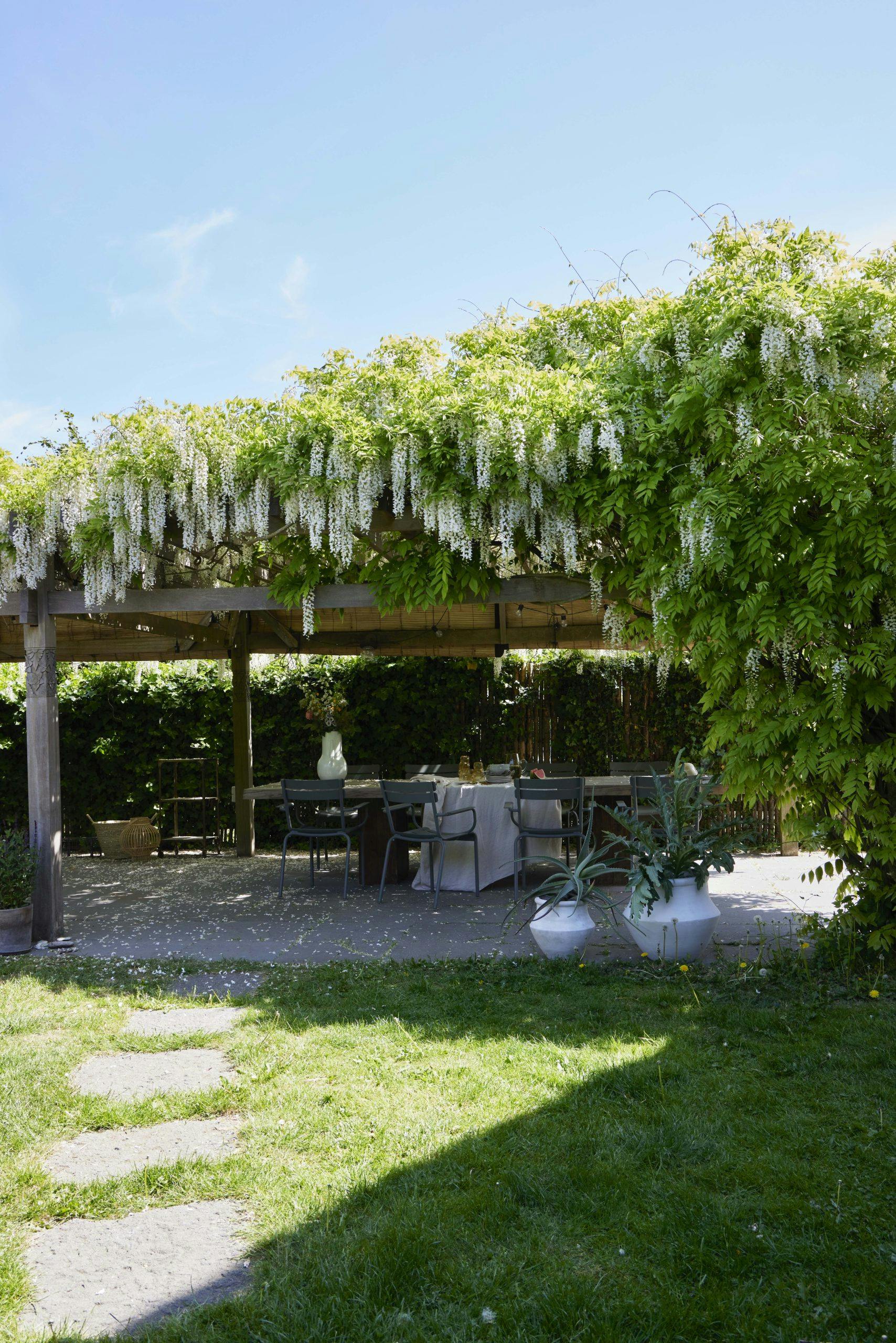 Den store pergolaen er dekket av en fantastisk, blomstrende blåregn i en vakker, hvit nyanse, noe som skaper en eventyrlig ramme rundt sommerens middager og fester. De tidligere eierne kjøpte bordet på Bali, mens stolene er fra Fermob.