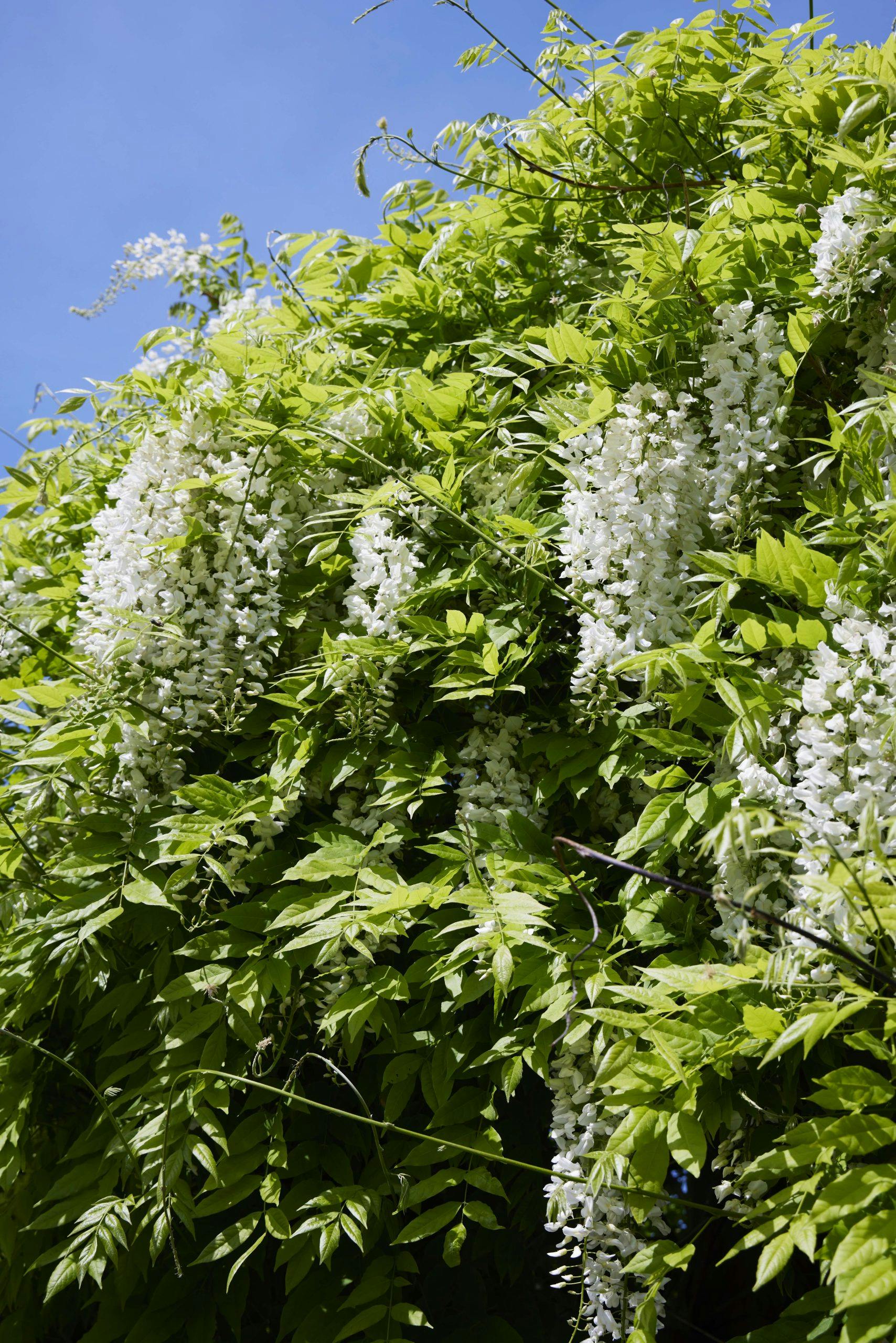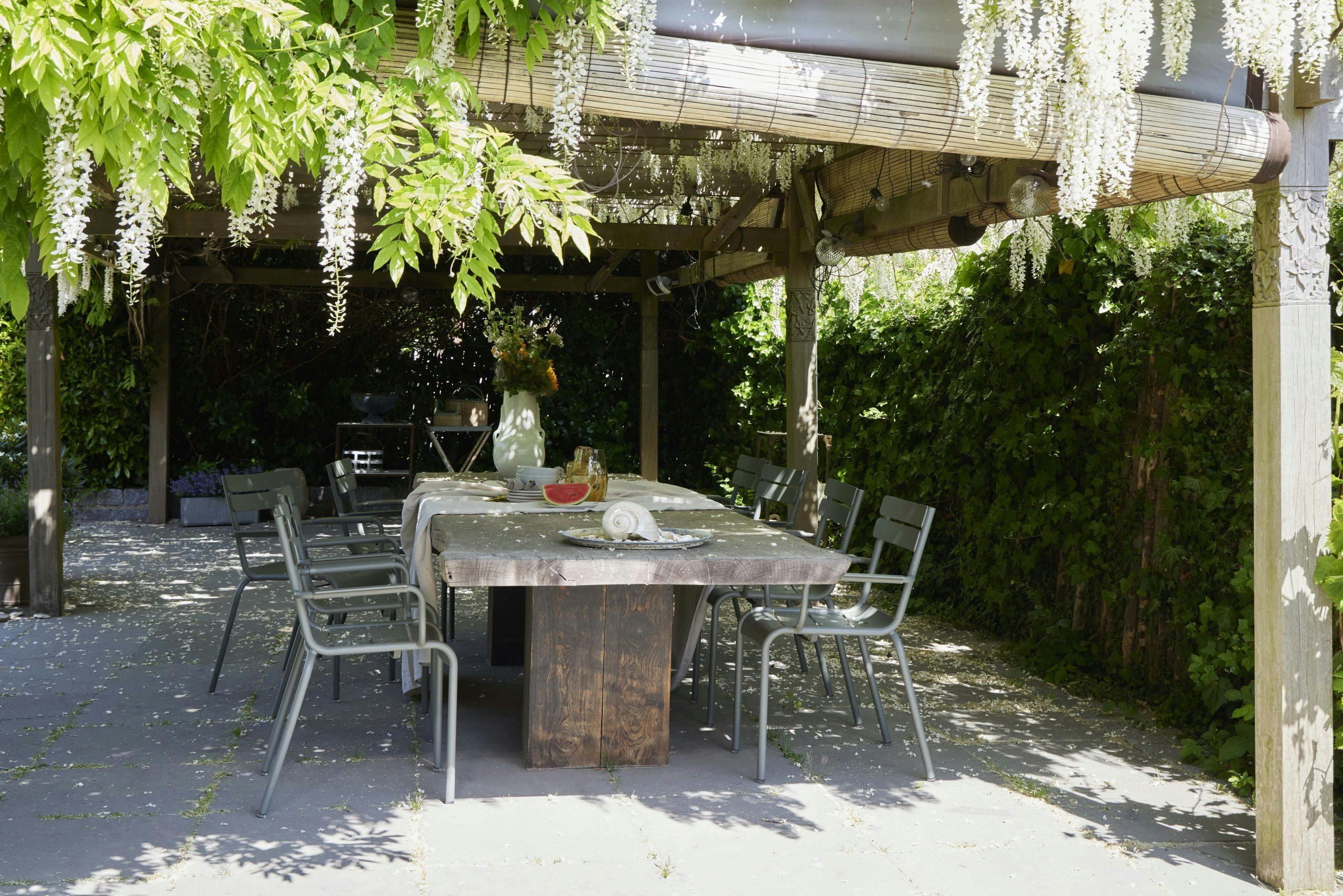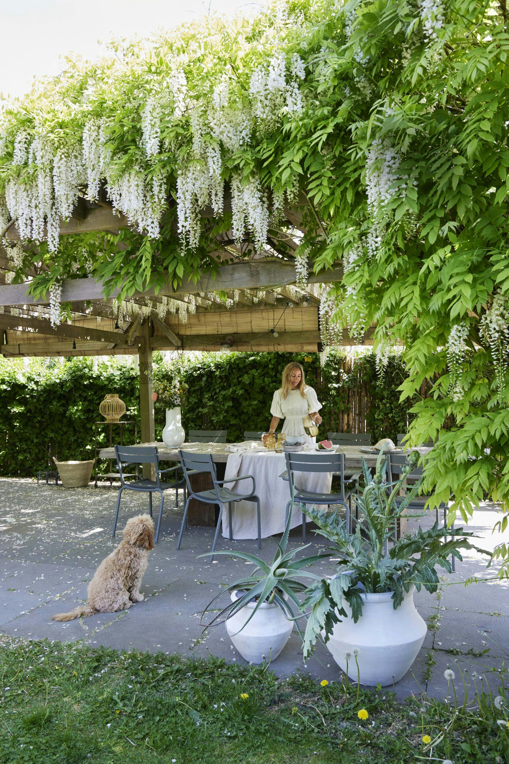 Den store pergolaen er dekket av en fantastisk, blomstrende blåregn i en vakker, hvit nyanse, noe som skaper en eventyrlig ramme rundt sommerens middager og fester. De tidligere eierne kjøpte bordet på Bali, mens stolene er fra Fermob.