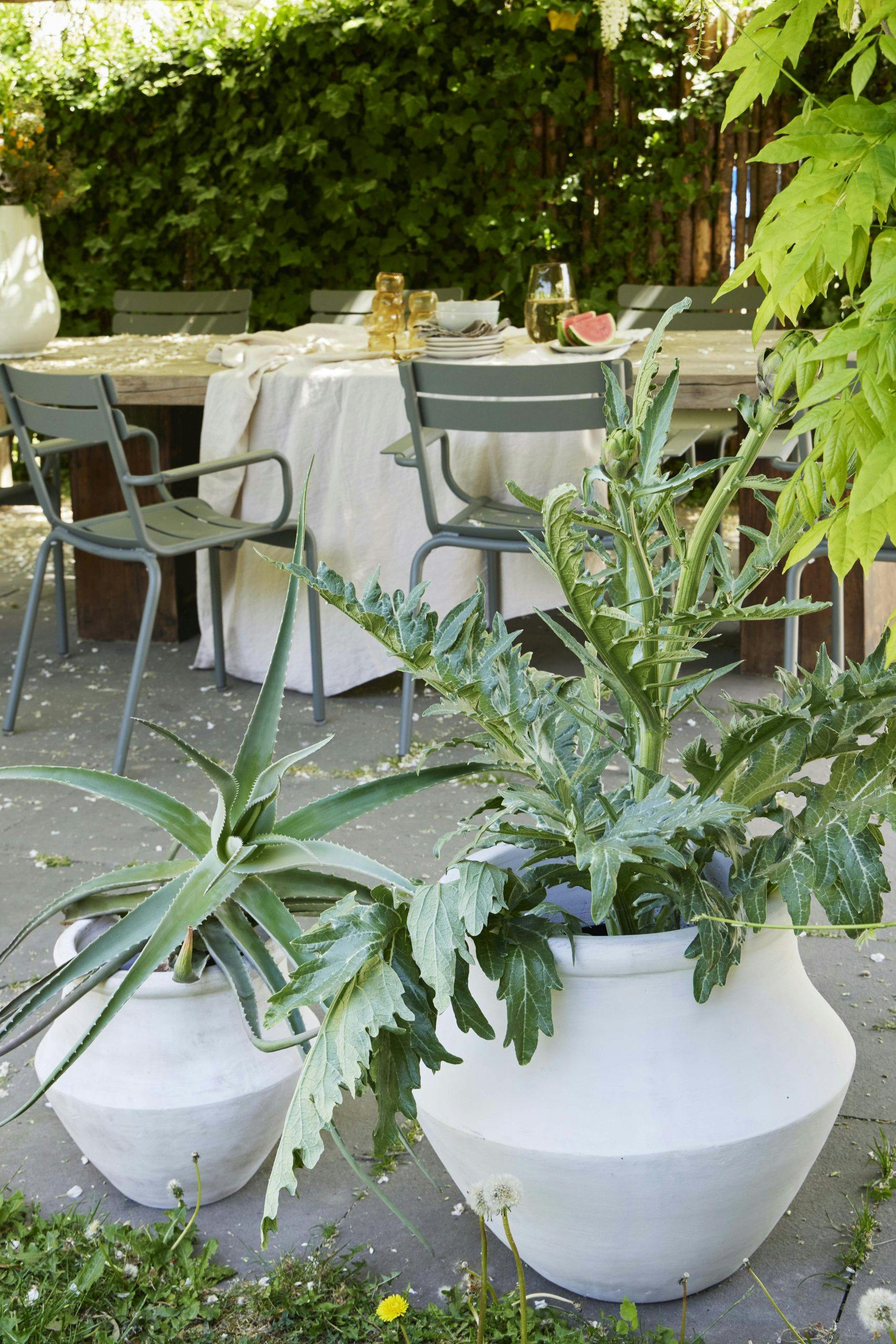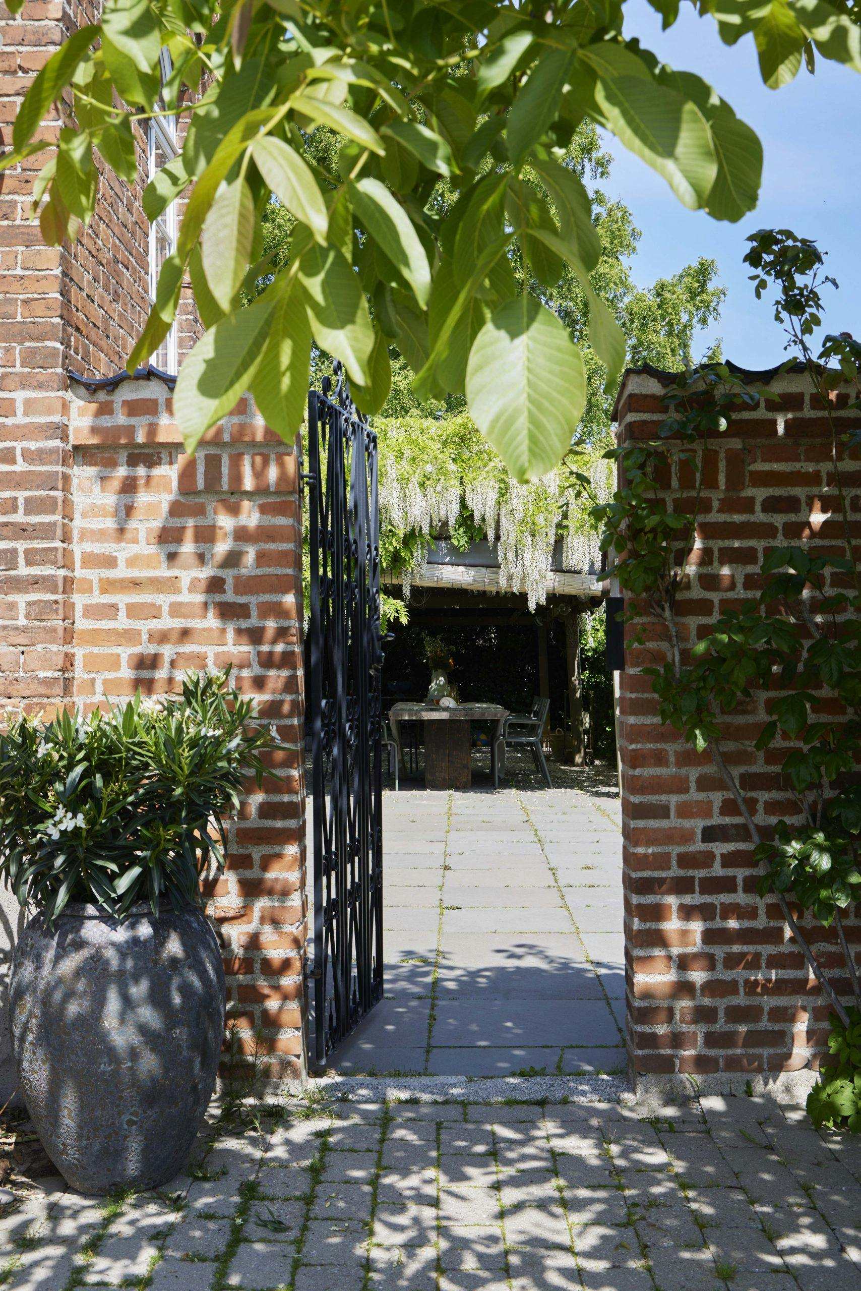 Hun har innredet flere områder i hagen, og det er alltid en plass som passer til dagens forskjellige gjøremål. Foran huset er det en liten frokostplass i morgensolen, rett ved labyrinten av lave hekker der barna og hunden gjerne leker. Ellers rommer hagen både en lounge til avslapning, en plass til en liten hvil i liggestolene og – selve rosinen i pølsen – den store spiseplassen under pergolaen, som er dekket av en voluminøs blåregn som i mai og juni fylles med hvite blomster og en helt fantastisk stemning.