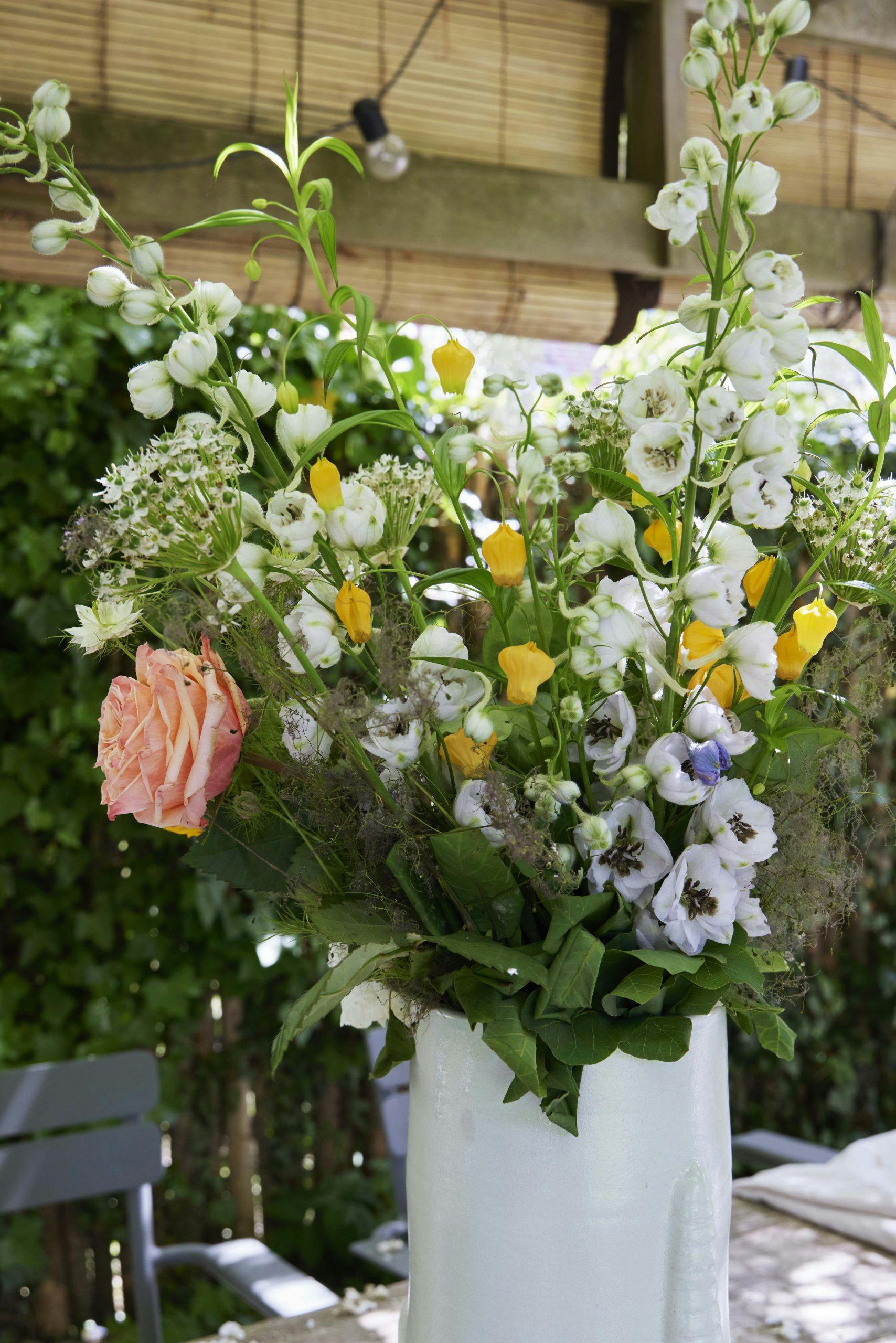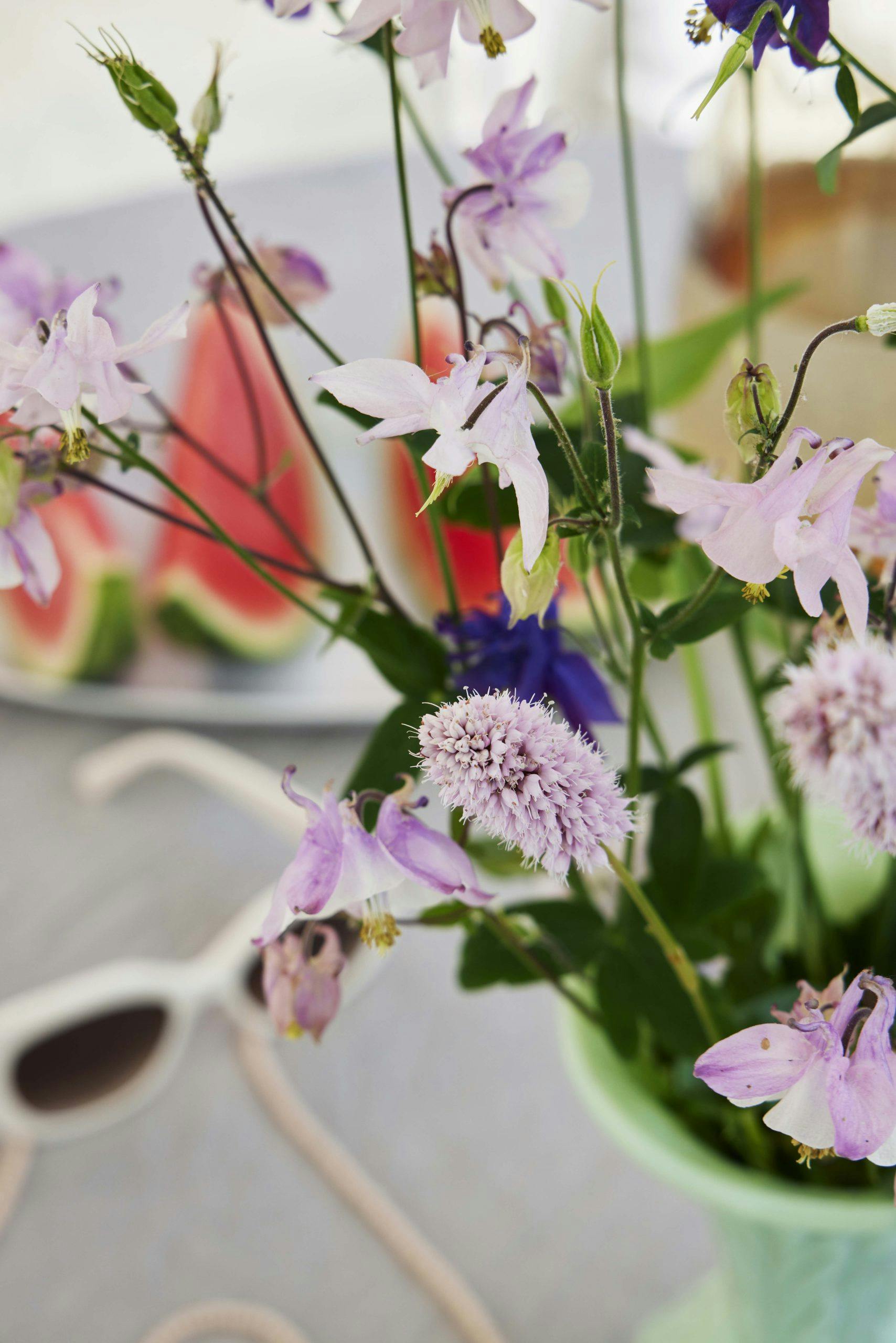 Nydelige sommerblomster skaper hygge på spisebordet. Den store, hvite vasen kommer fra Tine K Home.