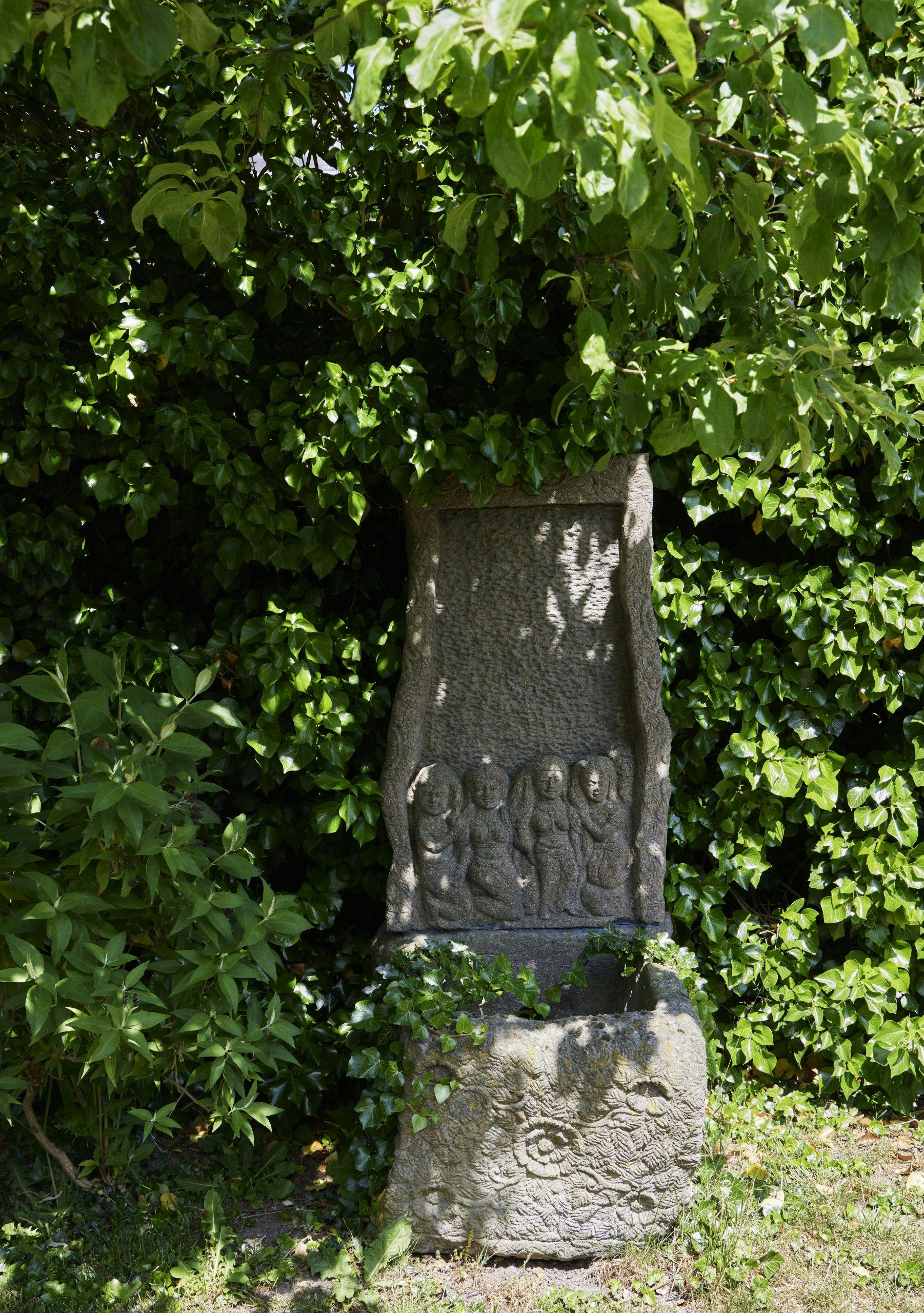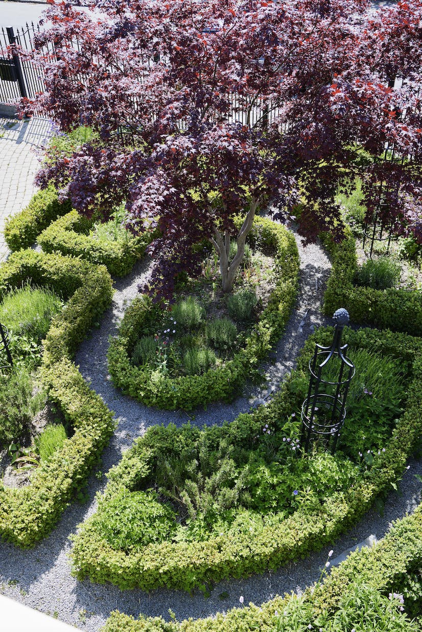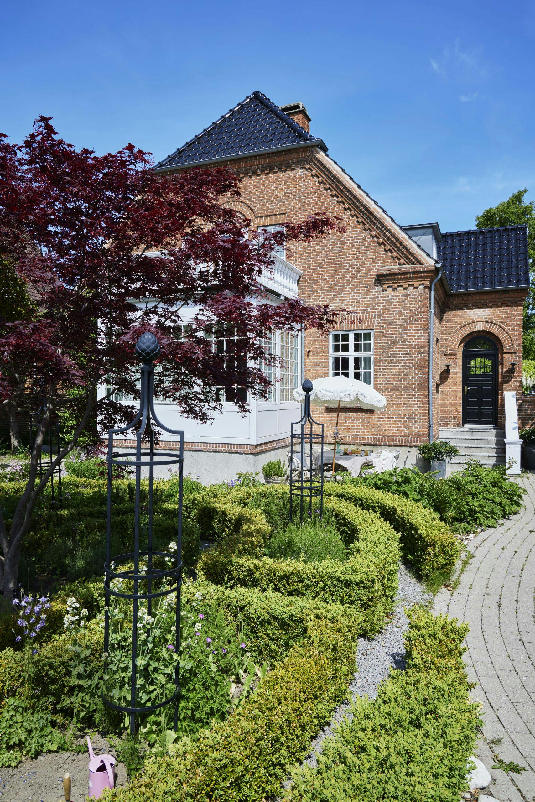 Foran huset er det en stor, grønn labyrint av lave hekker der barna leker gjemsel og leter etter egg i påsken. Gertrud og Jens har plantet lavendel og akeleier som får vokse vilt for å gjøre uttrykket litt mindre striglet.