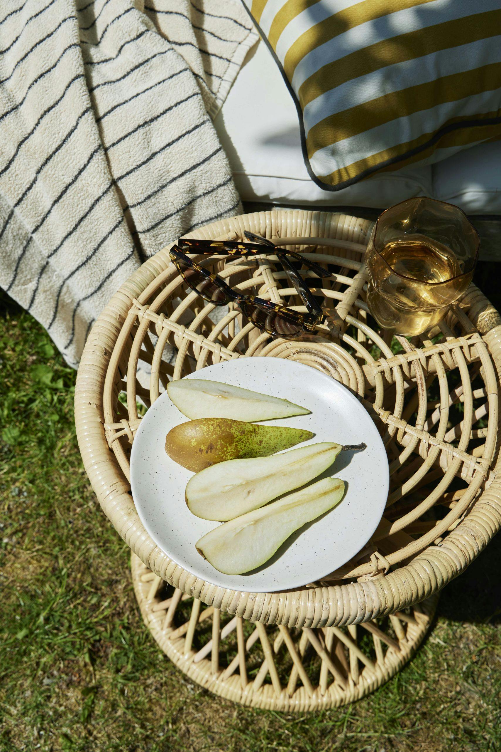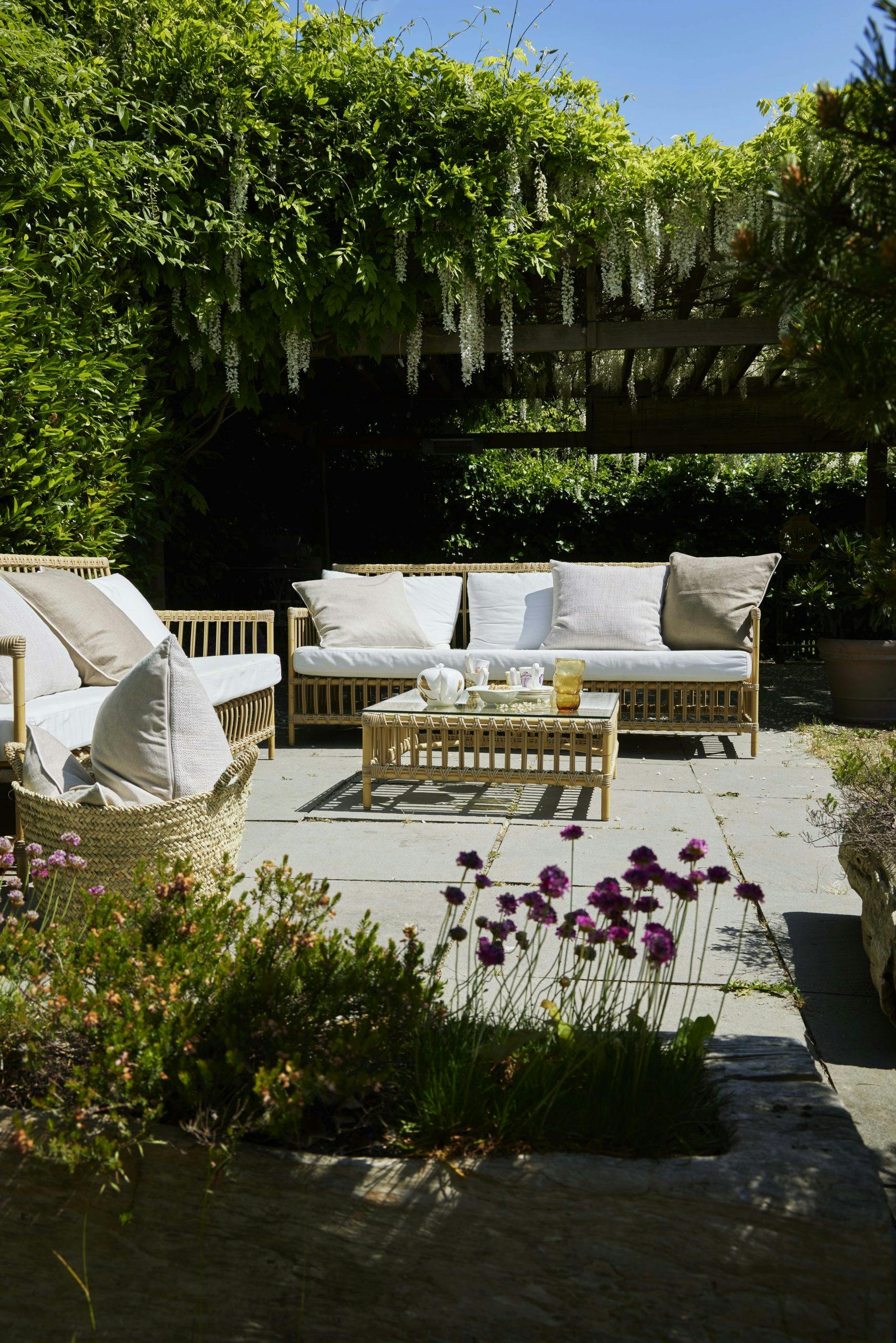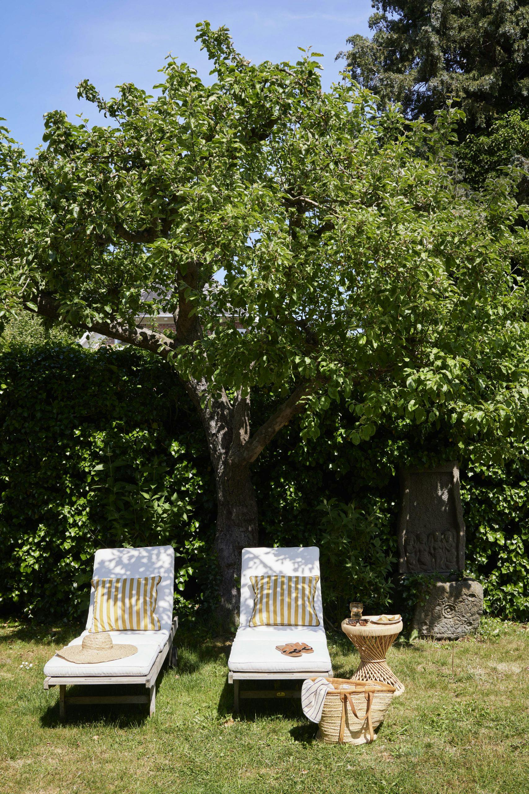 I hagen er det også innredet en deilig krok til en ettermiddagsdupp. De stripete putene er fra Broste Copenhagen, mens sidebordet og vesken kommer fra Tine K Home.