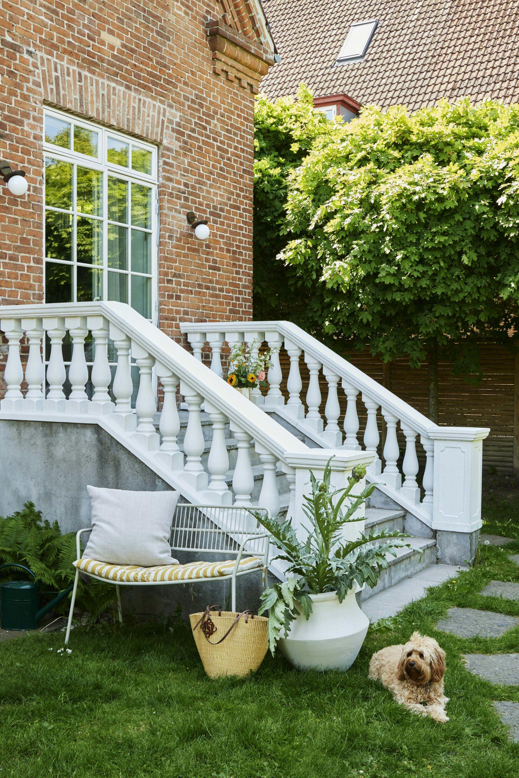 Den koselige, lille spiseplassen foran huset har morgensol, og her spiser familien gjerne frokost i helgene. Bordet er fra Fermob, duken fra Tine K Home og glassene fra Broste Copenhagen.