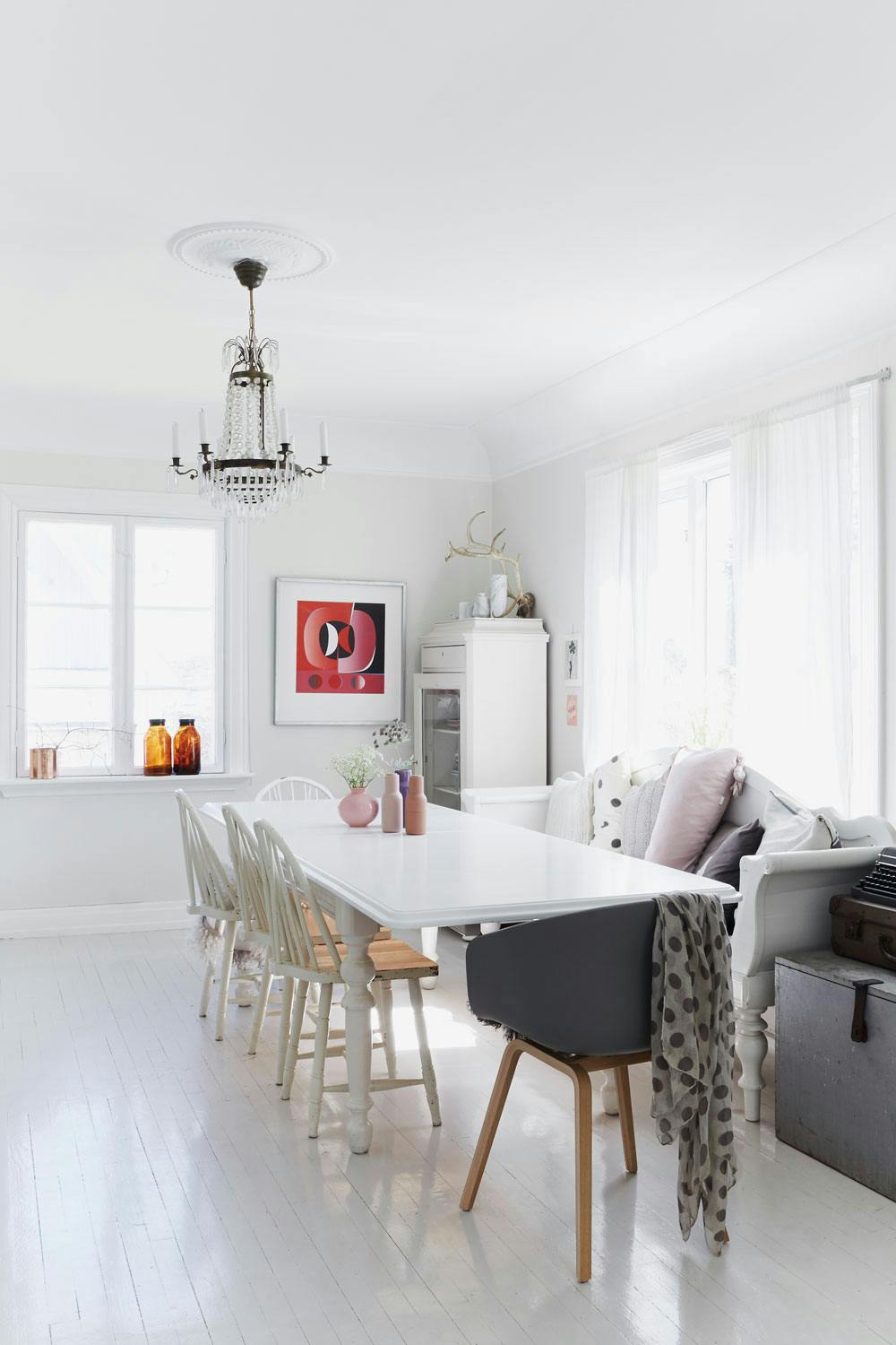 De gamle budalsstolene fra farmors hytte er utrolig komfortable, ifølge Inger Lill. Hun har malt dem hvite for å skape helhet i rommet. Den grå spisestuestolen fra Hay gir en moderne kontrast til arvestykkene.