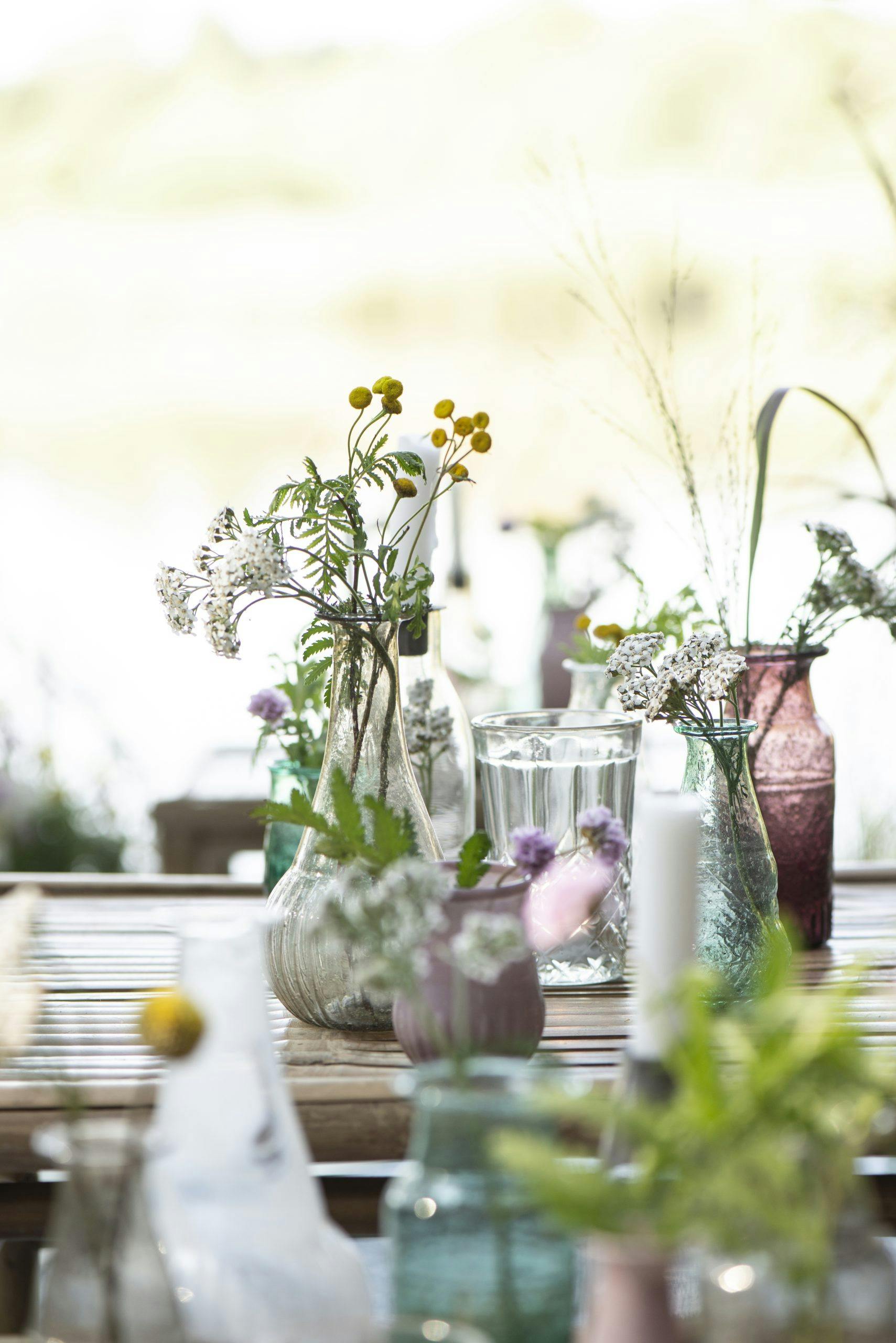 - Har du mye blomster i hagen eller er veikanten full av markblomster? Skap stemning på bordet med små og store buketter. Gjenbruk noen fine glassflasker eller jakt på gamle vaser på loppis og i bruktbutikker.