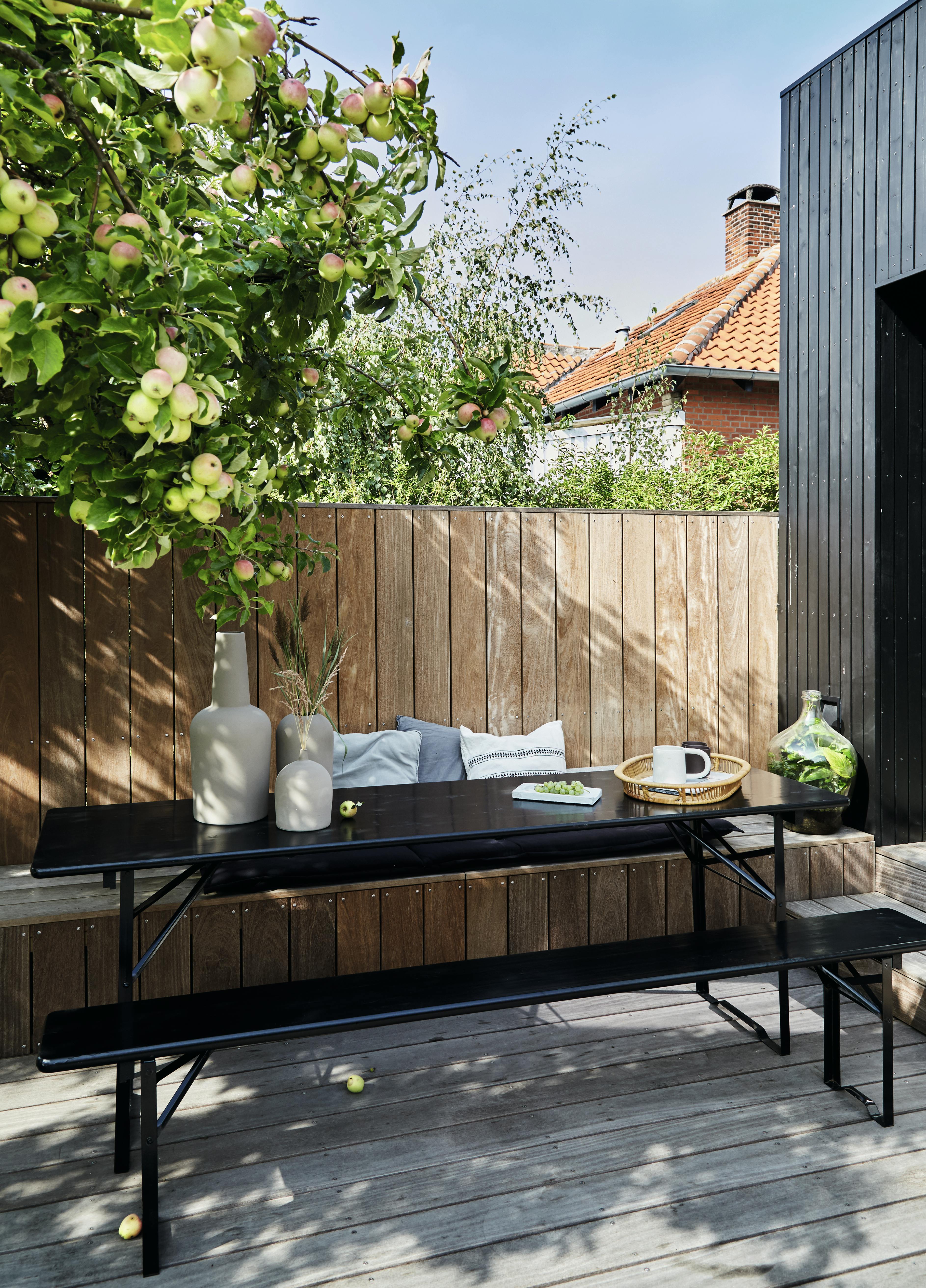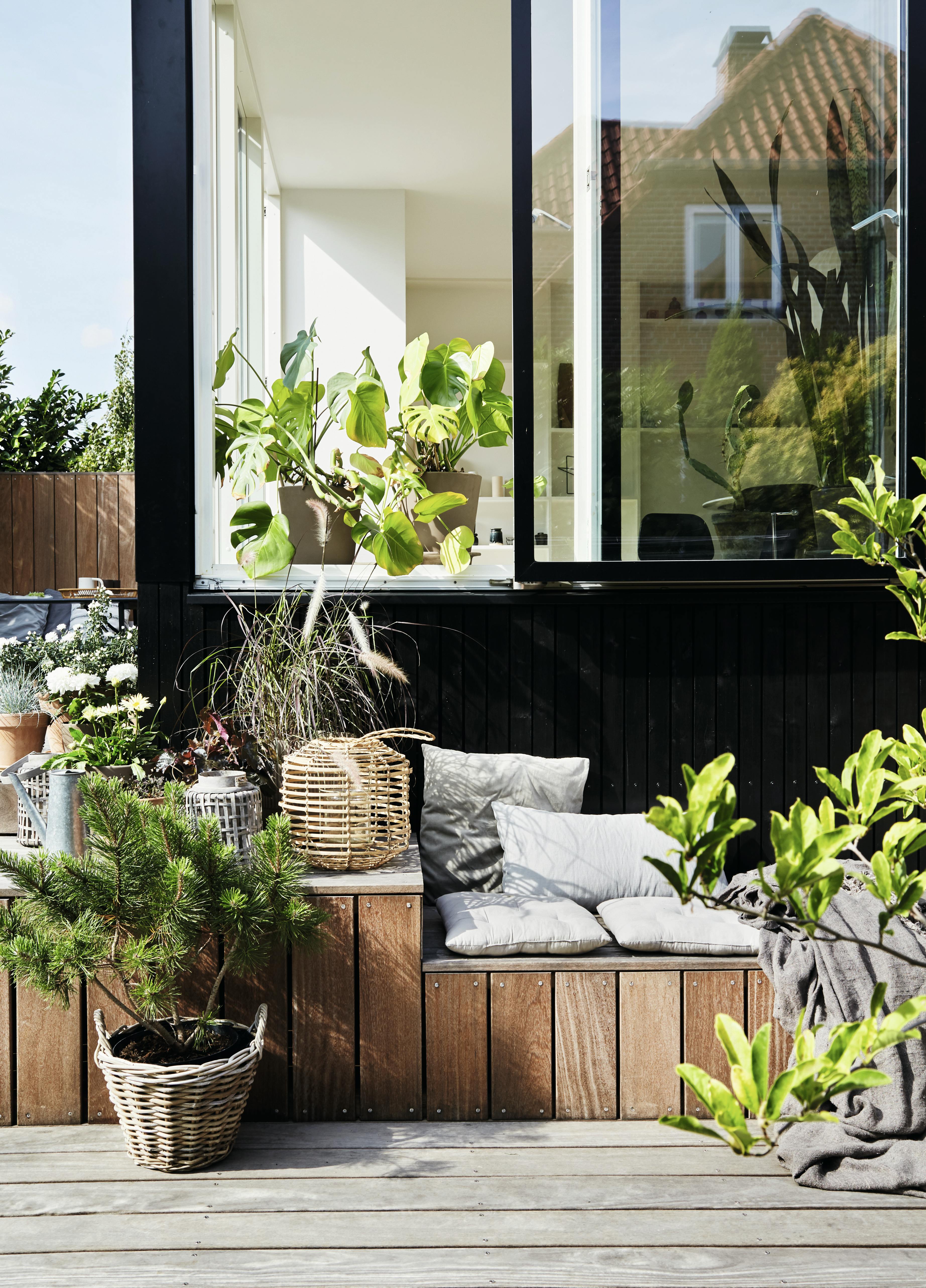 Lag et integrert bed i terrassen, og fyll det med trær og busker for å skape rom i hagen. I våre bed har vi plantet store bornholmske fikener, som er min absolutte favorittplante. Fikener er så flotte grafiske, og jeg er så glad i fiken! I tillegg har vi plantet i steinbed for å ha en grønn bunn i stedet for bar jord i bedet.