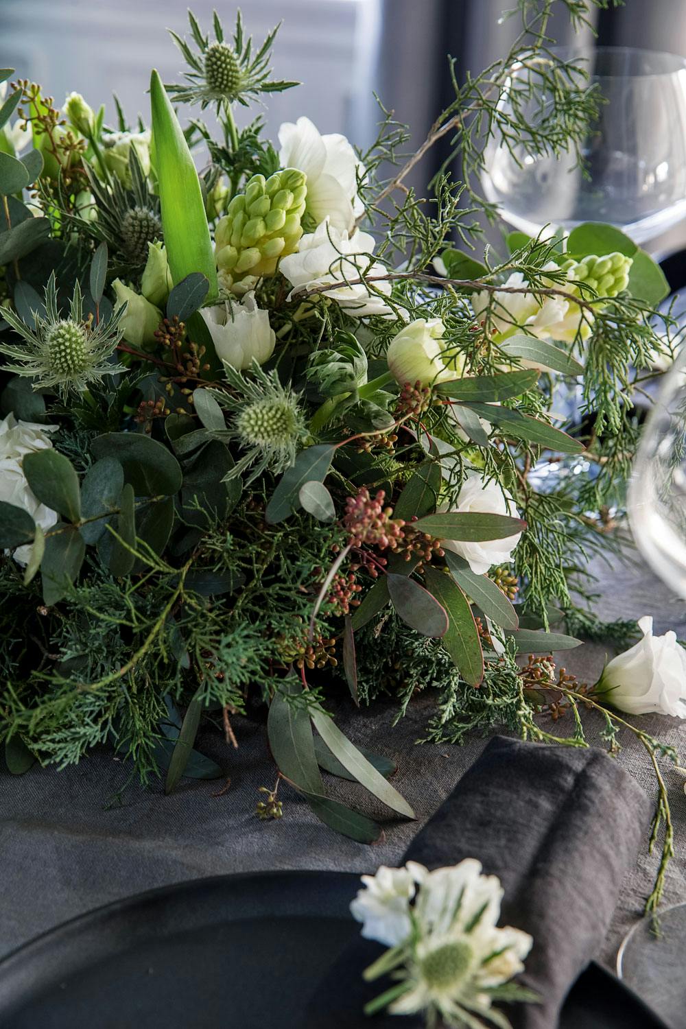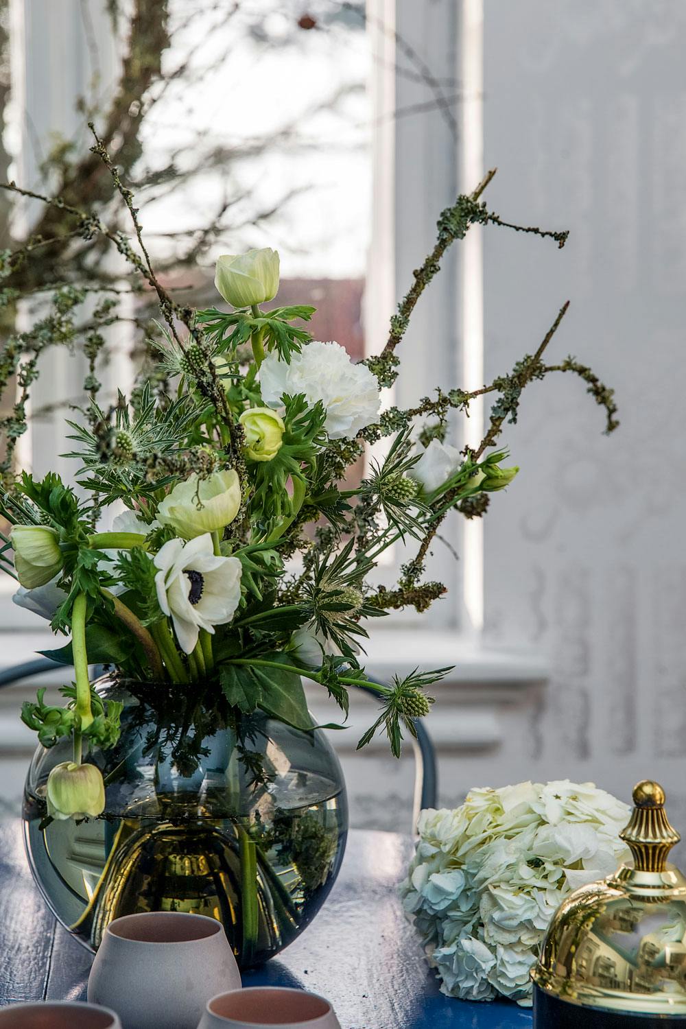 En flott, litt tilfeldig julebukett av kvister kledd med lav, anemoner, nelliker og tistler i en vase, er utrolig fint og stemningsskapende. Start med å plassere de større grenene, la dem gjerne krysse hverandre for å skape stødighet, og stikk deretter blomstene ned mellom dem. Kutt blomstene i forskjellige lengder for å få det kule, tilfeldige uttrykket.